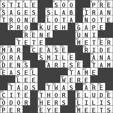 ACROSS 1. Vertical member of a panel or frame 6. "Barney Miller" actor Jack 9. Before (prefix) 12. Gurus 13. Thick slice 14. SW Asia republic 15. Heavy duty weighing machine 16. Globular water bottle used in Asia 17. Short letter 18. Adept person 19. Malaysian steamed pastry 20. Stare wonderingly 21. French philosopher Descartes 23. Single; one (prefix) 24. False hair 25. Distance measurement 28. Third mo. 30. Desist 34. Travel on an animal 35. Mouth or opening 36. Grin 38. Santa ___, CA 39. Lairs 41. Ascend 43. Scottish cap 44. Artist's stand 46. Docile 48. Area sheltered from the wind 49. Past tense of be (plural) 50. Bits 51. It was, poetically 53. "We ___ not amused" (Victoria) 56. Quote 57. Son of Odin 58. Evade 60. Aroma 61. Possessive pronoun 62. Ms. Damita and namesakes 63. For each 64. Sight organ 65. Confronts DOWN 1. Fast jet (abbr.) 2. Canvas cover 3. Composer Stravinsky 4. Poe poem 5. Compass dir. 6. A type of plum 7. Pledge 8. Chief or king in Benin or Nigeria 9. Conciliate 10. Pace 11. Compass dir. 13. Change direction abruptly 14. More lacking in sense or substance 19. Leg joints 20. Chewing product 22. And so on (abbr.) 24. Interpreter 26. Pulitzer Prize-winning author Ferber 27. 480, 500 or 516 sheets of paper 28. Method 29. Type of rug 31. Wet nurse (var.) 32. Title for a knight 33. Biblical high priest 37. _____ Park, CO 40. Sowing specialist 42. Ewer handle 45. French article 47. Ear of corn 49. Armed conflicts 50. Periodic rise and fall of the sea level 51. Those people 52. Had on 54. Court order 55. Prepare for publication 56. Police officer (slang) 57. Definite Article 58. Shade tree 59. Double-curved letter