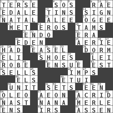 ACROSS 1. Laconic 6. Distress signal 9. Actress Charlotte 12. Peak District village in England 13. Canisters 14. Signal 15. Relating to or accompanying birth 16. Toward shelter 17. Double curve, resembling the letter S 18. Was introduced to 19. Greek god of love 20. Scottish caps 21. Inside; within (prefix) 23. Period 24. Genesis locale 25. Nest on high 28. Possessed 30. Artist's stand 34. Dormintory (informal) 35. Biblical high priest 36. Imelda's hoard 38. Flowery wreath 39. Loose flowing garment 41. Take place subsequently 43. Eastern Standard Time (abbr.) 44. Exchanges for money 46. Naughty children 48. Raised railways 49. Needle case 50. A single undivided whole 51. Puts into a specified state 53. Car or cant ending 56. Butter sub 57. A really long time 58. Bitter 60. Political cartoonist Thomas 61. Nanny 62. Haggard of country music 63. Followers of ems 64. Big collection agency 65. NE Netherlands city DOWN 1. "___ Little Indians" 2. Dutch treat 3. Pace 4. Scheduled 5. Snakelike fish 6. Grain storage tower 7. Washington bills 8. Compass dir. 9. Frustrating wastes of time 10. Eons 11. Compass dir. 13. Pacific island yam 14. Flew 19. Ferber et al. 20. Beverage made from leaves 22. Born 24. The property of being fit to eat 26. Angers 27. Give off 28. Possessive pronoun 29. _ vera 31. A female animal or person 32. Period of immesurable duration 33. French article 37. Sets of matching outer garments 40. American author Paul (1891-1958) 42. Australian flightless bird 45. Fast jet (abbr.) 47. Parts 49. Inactive volcano in Sicily 50. ____ Bator 51. Wither 52. Immeasurably long periods of time 54. Blunders 55. The longest river in the world 56. Single 57. Cuckoo 58. Nursemaid (var.) 59. Lair