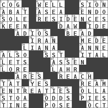 ACROSS 1. Gear tooth 4. Not ill 8. The Jewish people; Israel 12. Blind as ____ 14. At sea 15. Inside; within (prefix) 16. Flatfish 17. Dwellings 20. Peachy ____! 21. Fool 22. Binary compound 23. Goodbye (Sp.) 27. Necklace unit 29. SW Asia republic 31. Ancient Persian 34. Climbing, woody, usually tropical vines 35. Singer Murray 36. In addition 39. Fast jet (abbr.) 41. Slanted text style (abbr.) 42. Allows 43. NE Netherlands city 46. Old wives' tales, e.g. 47. Cowardly lion portrayer 48. Ancient Greek god of war 51. Arrive at 54. Make lace 56. Consenting reply 58. 480, 500 or 516 sheets of paper 61. Pleas 66. Rounded earthenware pot or jar 67. Portico 68. Likelihood 69. Sliced desserts 70. Prong on a fork 71. Introduce or present, as a question 72. Sep. follower DOWN 1. Keg 2. Mitch Miller's instrument 3. An organ shaped like a helmet 4. Armed conflict 5. Compass dir. 6. French article 7. Put down 8. Elected rep. 9. Happening 10. Wrote a lyric poem 11. Olfactory organ 13. Be inclined (to) 18. Pat or tap gently 19. She-sheep 24. One more than two 25. Mouth or opening 26. Without 28. With great haste 30. Rhinal 32. Heredity factor (abbr.) 33. Snakelike fish 34. Failure 36. Everything 37. Lion 38. Ski resort town in Vermont 40. Russian ruler of old 44. A female animal or person 45. Period 49. Sight organ 50. Ocean 52. Riding implement 53. Sun: prefix 54. Trial 55. Opposed to 57. Constrict 59. Actor Baldwin 60. Vertical spar for supporting sails 62. Actress Charlotte 63. Wedding promise 64. Begley and Asner 65. Compass dir.
