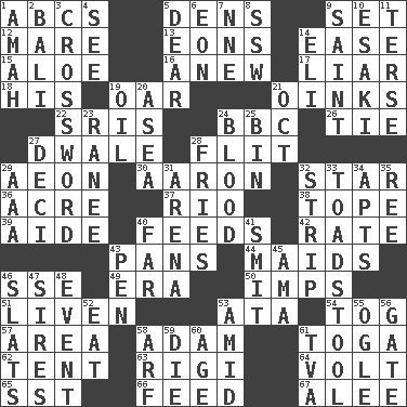 ACROSS 1. Lettered men learn these first 5. Lairs 9. Put into a specified state 12. Female horse 13. Immeasurably long periods of time 14. Relaxation 15. Medicinal plant 16. Afresh 17. One who doesn't tell the truth 18. Part of HMS, perhaps 19. Rowing implement 21. Pig sounds 22. Indian titles of respect 24. English channel? 26. Neckwear 27. A sleeping potion; an opiate (poet.) 28. Secret move to avoid paying debts 29. Period of immesurable duration 30. Composer Copland 32. Play the lead 36. 43,560 square feet 37. River (Sp.) 38. Drink excessively 39. Helper 40. Gives food to 42. Assign a rank or rating to 43. Zero-star reviews 44. Women servants 46. Compass dir. 49. Period 50. Naughty children 51. Make or become more lively 53. "One Day ___ Time" 54. Coat; cloak 57. Length times width 58. First man 61. Ancient Roman robe 62. Portable shelter 63. Swiss mountan, "Queen of the Mountains" 64. Electrical Unit 65. Fast jet (abbr.) 66. Nourish 67. Toward shelter DOWN 1. Nursemaid 2. Indonesian resort city 3. What you're doing now 4. Perceive with the eye 5. Letter starter 6. Period of immesurable duration 7. Compass dir. 8. Compass dir. 9. Virtuous person 10. 1973 Nobel Price Winner (Physics) Leo 11. Laconic 14. Biblical high priest 19. Lubricate 20. Toward the sea 21. Sep. follower 23. The wife of a rajah (variant) 24. Vital fluid 25. Storage container 27. Tenth: prefix 28. Strips of potato fried in deep fat 29. American Automobile Association (abbr.) 31. Sports stadium 32. Long narrow piece of something 33. Inedible or poisonous agaric 34. Flats, for short 35. To sift 40. At a great distance 41. Stricken, poetically 43. Fenced enclosure 45. Nursemaid (var.) 46. Narrow boards 47. Male parents of animals 48. Happening 52. Ingest 53. Among 55. Stare at amorously 56. Yard entry 58. Sandy's bark 59. Expire 60. Grow older 61. Federal power corp.