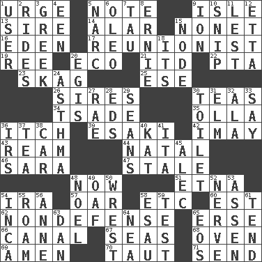 ACROSS 1. Goad 5. Make mention of 9. Capri or Wight 13. Title for a man of rank and authority 14. Having or resembling wings 15. Music written for nine 16. Genesis locale 17. One who advocates reunion 19. To riddle 20. Environmental prefix 21. It would 22. Parent Teacher Association (abbr.) 23. Heroin 25. Compass dir. 26. Male parents of animals 30. Beverages made from leaves 34. Sadhe (variant) 35. Water jar 36. Hankering 39. 1973 Nobel Price Winner (Physics) Leo 42. "If ____ say so..." 43. 480, 500 or 516 sheets of paper 44. Brizilian seaport 46. "Two Mules for Sister ____" 47. Showing deterioration from age 48. Immediately 51. Inactive volcano in Sicily 54. Retirement account (abbr.) 57. Boat paddle 58. And so on (abbr.) 60. Eastern Standard Time (abbr.) 62. Unrelated to defense, as in spending 65. Celtic language 66. Lessep's creation 67. Oceans 68. Baking chamber 69. So be it 70. Drawn tight 71. Post DOWN 1. One who makes use of a thing 2. Amusement-park features 3. Of Greece 4. Car or cant ending 5. Drug cop 6. Butter sub 7. The 19th letter of the Greek alphabet 8. Bert's buddy 9. Electrically charged atom 10. Clip 11. For fear that 12. Singer James 15. Thickened enlargement 18. It is 20. The front part of a cuirass 24. Respiratory problem 27. Actress Charlotte 28. Begley and Asner 29. Seines 30. Bathroom plumbing fixture 31. Shade tree 32. Insect wing 33. Declare 36. Big collection agency 37. Afternoon social gathering 38. Automobile 40. Krazy ___ of comics 41. Call ___ day 45. Actor Baldwin 48. Christmas carol 49. Clumsy lout 50. Obtain by seizing forcibly or violently 52. Boldness 53. NE Netherlands city 54. South American Indian 55. Wander aimlessly 56. Queen of England 1702-14 58. Son of Isaac 59. Trial 61. Watch over 63. One of the 12 tribes of Israel 64. Teachers' org. 65. Greek goddess of the dawn