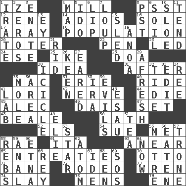 ACROSS 1. Ending with capital 4. Place where flour is made 8. Inconspicuous attention getter 12. French philosopher Descartes 14. Goodbye (Sp.) 16. Flatfish 17. Like ___ of sunshine 18. Census information 20. Carrier 22. Fenced enclosure 23. Directed 24. Compass dir. 25. Mamie's husband 28. ___ good deed 30. The content of cognition 31. Following 35. Apple computer (short form) 37. One of the Great Lakes 40. Travel on an animal 41. Australian parrot (variant) 42. Boldness 44. Singer Brickell 45. Actor Baldwin 46. Raised platform 47. Arrange properly for use 48. Memphis, Tenn. Street 50. Thin strip of wood or metal 52. Raised railways 54. Take to court 55. Was introduced to 58. Actress Charlotte 61. Call ___ day 63. Approach 65. Pleas 70. "Beetle Bailey" pooch 71. Object of repulsion 72. Cowboy competition 73. Songbird 74. Kill 75. Not women's 76. Compass dir. DOWN 1. Feeling or showing extreme anger 2. Nothings 3. Related on the mother's side 4. Atlas unit 5. Wedding promise 6. Mouth edge 7. Central Nebraska county 8. Pacific Standard Time (abbr.) 9. The visible part of the earth's surface 10. _ gin 11. Be inclined (to) 13. Sight organ 15. Downhill vehicle 19. Small Philippine buffalo 21. To free from 26. Peachy ____! 27. Having ears or earlike features 29. Anew 30. Tapering mass of hanging ice 32. Event that recurs at intervals 33. Prepare for publication 34. To sift 35. Undercover agent 36. Type of rug 38. Lyricist Gershwin 39. Vices 41. Experiment locale 43. Son of Isaac 49. Writer Wiesel 51. Afternoon social gathering 53. Play the lead 55. Distance measurement (Brit.) 56. Eroded 57. Marketplace scale 58. Confederate soldiers (slang) 59. Of or related to the anus 60. Inactive volcano in Sicily 62. Smallest unit of an element 64. Immediately 66. Marina Del _, California 67. Binary compound 68. Car or cant ending 69. Mayday
