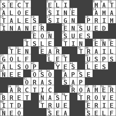 ACROSS 1. Religious group 5. Connecticut Ivy Leaguer 8. Floor covering 11. _ vera 12. Trig term 14. Nanny (var.) 15. Falsehoods 17. Public display of a written message 18. Demure 19. More lacking in sense or substance 21. Took place subsequently 23. A really long time 25. Takes to court 26. Small island 27. Shallow baking pan 28. Compass dir. 31. Nine, plus one 33. Hearing organ 35. Lag or linger behind 37. Eighteen holes 38. Allow 40. United States Postal Service (abbr.) 41. Columnist Joseph or Stewart 43. It is so 45. French article 46. Born 47. Bear (Spanish) 50. Domed church section 52. Mouths or openings 53. Plant excrement 54. Northern region 56. Nomad 61. Cy Young winner Saberhagen 62. Political cartoonist Thomas 65. Collection of objects 66. It would 67. Loyal 68. One of the Great Lakes 69. Modern: prefix 70. Ocean 71. Itself DOWN 1. Suttee (variant) 2. Flair 3. Root beer relative 4. Adolescent 5. Double-curved letter 6. Cards in a Roman deck? 7. Eat 8. Female horse 9. Among 10. Scottish cap 13. World-weariness 16. Perceives with the eye 18. Fluid product of inflammation 20. Hero or heavy, e.g. 22. Transmitted 24. Actress Patricia 26. A message received and understood 28. Relaxation 29. Pinches, bites 30. Raised railways 31. Lacquered or enameled metalware 32. Otherwise 34. Marina Del _, California 36. General guideline 37. Separate the seeds from cotton 39. Beverages made from leaves 42. Left side of a ship or aircraft 44. Practice fight 48. Virtuous person 49. Motion picture awards 51. Blemish 52. Sep. follower 54. Johnson of "Laugh-In" 55. Make new 57. Ancient Greek god of war 58. Greater amount 59. Morally bad or wrong 60. Coral ridge 61. Storage container 63. Institute legal proceedings 64. Beverage made from leaves