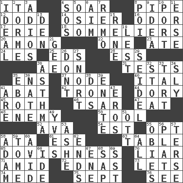 ACROSS 1. Call ___ day 4. Fly high 8. Corncob 12. Texas town _ City 14. Flexible twig of a willow tree 16. Aroma 17. One of the Great Lakes 18. Wine waiters 20. Amid 22. Single 23. Had dinner 24. French article 25. Begley and Asner 28. Double-curved letter 30. A really long time 31. Trials 35. Followers of ems 37. Thickened enlargement 40. Slanted text style (abbr.) 41. Blind as ____ 42. Heavy duty weighing machine 44. Rowboat 45. Writer of Portnoy's Complaint (1969) 46. Russian ruler of old 47. Consume 48. Foe 50. Implement 52. Actress Gardner 54. Eastern Standard Time (abbr.) 55. Choose 58. _ moment's notice (2 wds.) 61. Compass dir. 63. Eating place 65. Innocence, gentleness, or tenderness 70. One who doesn't tell the truth 71. Among 72. Ferber et al. 73. Allows 74. Ancient Persian 75. Back-to-school mo. 76. Perceive with the eye DOWN 1. Perfect 2. Singer Mel 3. Goodbye (Sp.) 4. Distress signal 5. Bear (Spanish) 6. Direct toward a target or goal 7. San ____ (Riviera town) 8. Luau course 9. It may be bright or harebrained 10. Left side of a ship or aircraft 11. Celtic language 13. Lair 15. French philosopher Descartes 19. For fear that 21. Turn to the right 26. Do not 27. Derisive sound 29. A glass for beer 30. Respiratory problem 32. Portico 33. Small pie 34. Wily 35. Inky black, to poets 36. Nathan's nickname 38. Two (Sp.) 39. Related on the mother's side 41. "We ___ not amused" (Victoria) 43. Greek god of love 49. Jacques Cousteau's middle name 51. Baseball player Mel 53. American tennis player Robert 55. Off-Broadway awards 56. Food holder 57. Laconic 58. First man 59. Heavy book 60. Enthusiastic 62. Conclusions 64. Everything 66. Binary compound 67. Compass dir. 68. Plant excrement 69. Fast jet (abbr.)