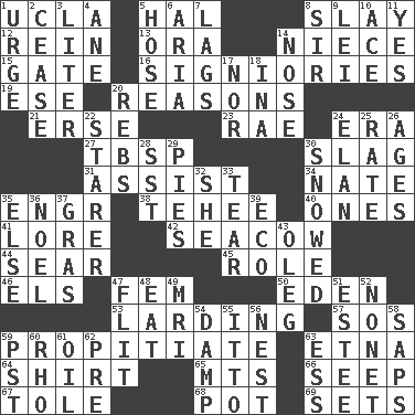ACROSS 1. Southern CA. univ. 5. Actor Linden 8. Kill 12. It's straight from the horse's mouth 13. Mouth or opening 14. Sibling's daughter 15. Yard entry 16. Seigniories (variant) 19. Compass dir. 20. Thinks logically 21. Celtic language 23. Actress Charlotte 24. Epoch 27. Cook's measure (abbr.) 30. Volcanic refuse 31. Aid 34. Nathan's nickname 35. Engineer (abbr.) 38. Giggle 40. Washington bills 41. Old wives' tales, e.g. 42. Manatee 44. Burn superficially 45. Hero or heavy, e.g. 46. Raised railways 47. Opposite of masc. 50. Genesis locale 53. Preparing or cooking with lard 57. Distress signal 59. Conciliate 63. Inactive volcano in Sicily 64. Upper-body garment 65. Mountains (abbr.) 66. Ooze 67. Lacquered or enameled metalware 68. Cooking vessel 69. Puts into a specified state DOWN 1. Goad 2. Stop 3. 61 cubic inches 4. One (Scot) 5. Stockings 6. Roberta Peters solo 7. Straggles 8. Title for a knight 9. Flowery wreath 10. Adept person 11. Consenting reply 14. Olfactory organ 17. Not either 18. _ tizzy (2 wds.) 20. Confederate soldiers (slang) 22. A viewer who gazes fixedly 24. Enthusiasm 25. Assign a rank or rating to 26. Eons 28. Fast jet (abbr.) 29. Sliced desserts 30. Frozen precipiation fell 32. A female animal or person 33. Rend 35. Otherwise 36. Christmas carol 37. Pate de foie ____ 39. Environmental prefix 43. Cassini of fashion 47. Secret move to avoid paying debts 48. Ingest 49. Medical imaging device (abbr.) 51. First name in cosmetics 52. Music written for nine 54. Moist 55. "Tell ____ the Marines!" 56. A home for chicks 58. Plant excrements 59. Pacific Standard Time (abbr.) 60. 17th letter of the Greek alphabet 61. Petroleum 62. Before (prefix) 63. Curvy letter