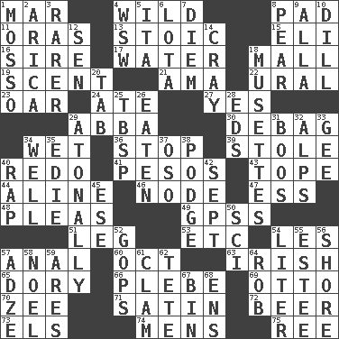 ACROSS 1. Spoil 4. Rampant 8. Groovy apt. 11. Mouths or openings 13. Unemotional 15. Biblical high priest 16. Beget 17. Wetness 18. Promenade 19. Aroma 21. Nursemaid (var.) 22. Mountain range 23. Rowing implement 24. Had dinner 27. Affirmative reply 29. Swedish rock group 30. Debunk (Brit. slang) 34. Dripping 36. Halt 39. Took without asking 40. Make new 41. Mexican monetary units 43. Drink excessively 44. Place in a line 46. Connecting point 47. Double-curved letter 48. Entreaties 49. Global Positioning Systems (abbr.) 51. Part of a journey 53. And so on (abbr.) 54. French article 57. Of or related to the anus 60. Sep. follower 63. From or relating to Ireland 65. Rowboat 66. First-year military academy student 69. Von Bismarck 70. Last letter of the English alphabet 71. Smooth fabric 72. Fermented drink made from hops 73. Raised railways 74. Not women's 75. To sift DOWN 1. With motion or animation 2. N. Chile seaport 3. More valued for its uncommonness 4. Compass dir. 5. Call ___ day 6. Globular water bottle used in Asia 7. South Vietnam president (1954) 8. Lightbulb-shaped fruit 9. Silent film actress Nazimova 10. Deli pickle 12. Elected rep. 14. Supercomputer manufacturer 18. French bagpipes 20. Bar bill 25. Cook's measure (abbr.) 26. Consumed 28. Begley and Asner 29. Without tonality 31. Scornful sounds 32. High mountains 33. Turn to the right 34. Not ill 35. Singer Brickell 37. Bear (Spanish) 38. Plash 40. Strike 42. Back-to-school mo. 45. Compass dir. 50. _-fi 52. Republicans 54. 61 cubic inches 55. First name in cosmetics 56. Dinah or Pauly 57. Axlike tool, used for shaping wood 58. Christmas carol 59. Ancient Greek god of war 61. Burrowing marine mollusk 62. False hair 64. Director Reiner 67. Storage container 68. Followers of ems