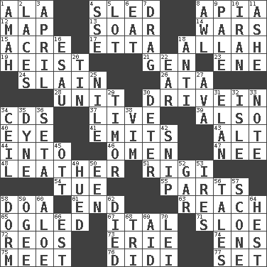 ACROSS 1. Wing 4. Downhill vehicle 8. Capital of Western Samoa 12. Atlas unit 13. Fly high 14. Armed conflicts 15. Land measure 17. Singer James 18. Assad's deity 19. Robbery 21. Commissioned mil. rank 23. Compass dir. 24. Killed 26. _ moment's notice (2 wds.) 28. A single undivided whole 30. Popular '50s hangout 34. Music discs 37. Moving, as bait 39. In addition 40. Sight organ 41. Gives off 43. The first octave above the treble staff 44. To the inside or interior of 46. Sign of something about to happen 47. Born 48. Cordwainer's material 51. Swiss mountan, "Queen of the Mountains" 54. Third day of the wk. 55. Components 58. ___ good deed 61. Conclude 63. Arrive at 65. Stared 67. Slanted text style (abbr.) 71. A type of plum 72. Vintage cars 73. One of the Great Lakes 74. Followers of ems 75. Rendezvous 76. "You Light Up My Life" star Conn 77. Arrange properly for use DOWN 1. Wet nurse 2. Shoestrings 3. Showery time 4. Compass dir. 5. Car dealer's back yard 6. Consume 7. To trail on the ground 8. Leather borer 9. Diluted with white 10. SW Asia republic 11. American tennis player Robert 16. Son of Isaac 18. Against 20. Metal container 22. Hearing organ 25. Mediterranean tributary 27. Actress Gardner 29. The easternmost of the Lesser Sundas 30. Prevent from occurring 31. Liveliness 32. Small island 33. Observe 34. To provide with a ceiling 35. Centimeter-gram-second unit of force 36. Bristle 38. Zeal 42. Clip 45. Baseball player Mel 49. Took on color 50. Car or cant ending 52. Slender fish 53. Angers 56. Stories 57. Biscuitlike quick bread 58. Dormintory (informal) 59. Double curve, resembling the letter S 60. Medicinal plant 62. Passed on 64. Command 66. Eastern Standard Time (abbr.) 68. Three (prefix) 69. Assist 70. Luau accessory
