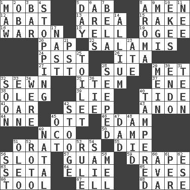 ACROSS 1. Disorderly crowds 5. Pat or tap gently 8. So be it 12. Blind as ____ 13. Length times width 15. Libertine 16. Make _____ (do battle with) 18. Shout 19. Double curve, resembling the letter S 20. Infant food 22. Deli grouping 24. Inconspicuous attention getter 26. Call ___ day 27. "Tell ____ the Marines!" 28. Institute legal proceedings 29. Was introduced to 32. Stitched 35. A distinct part 37. Compass dir. 38. Cassini of fashion 39. Untruth 40. Event that recurs at intervals 41. Boat paddle 42. Ooze 43. At once, immediately (arch.) 44. Compass dir. 45. Baseball player Mel 46. Dutch treat 49. Non-commissioned officer (abbr.) 50. Moist 51. Speakers 55. Pass on 56. Slit 57. Island territory of the United States 59. Window treatment 63. Bristle 64. Writer Wiesel 65. Nights before holidays 66. Utensil 67. Pipe bend 68. Have the gumption DOWN 1. Informal term for the mouth 2. Chief or king in Benin or Nigeria 3. Soap unit 4. Ceasing 5. 24 hours 6. Ancient Greek god of war 7. Actor Lugosi 8. Odor 9. Wise men 10. Makes supply last 11. Born 14. Plant genus of onion and garlic 17. Political cartoonist Thomas 21. Pacific Standard Time (abbr.) 23. Had dinner 25. Bathroom plumbing fixture 28. Oozed 29. Count _ (2 wds.) 30. Inside; within (prefix) 31. Adolescent 32. Within a short period 33. Style 34. We are 36. Neckwear 40. ________ with (broke a safety seal) 42. Moe Howard, for one 45. Sep. follower 47. June honoree 48. Among 49. Relating to or accompanying birth 51. Butter sub 52. Printing process, for short 53. General guideline 54. Move on water 56. Fast jet (abbr.) 58. Cartoonist voice _ Blanc 60. Actress Gardner 61. For each 62. Compass dir.