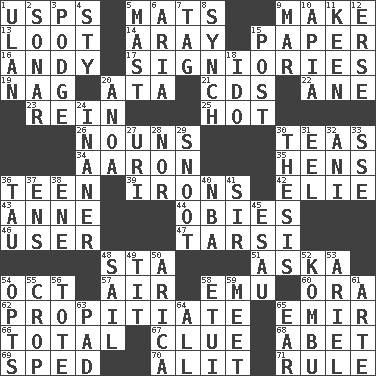 ACROSS 1. United States Postal Service (abbr.) 5. Floor protectors 9. Cause to be 13. Plunder 14. Like ___ of sunshine 15. Some stationery 16. Actor Griffith 17. Seigniories (variant) 19. Tired old horse 20. _ moment's notice (2 wds.) 21. Music discs 22. A saturated hydrocarbon 23. It's straight from the horse's mouth 25. Being at a high temperature 26. Parts of speech 30. Beverages made from leaves 34. Composer Copland 35. Coop moms 36. Adolescent 39. Metal shackles 42. Writer Wiesel 43. Singer Murray 44. Off-Broadway awards 46. One who makes use of a thing 47. Tarsus (plural) 48. R.R. building 51. "____ silly question..." 54. Sep. follower 57. Atmosphere 58. Australian flightless bird 60. Mouth or opening 62. Appease 65. Arab leader 66. Add up to 67. A slight indication 68. Collude with 69. Broke a traffic law 70. Set down 71. Court order DOWN 1. ____ Bator 2. Underwater navigation system 3. Puddle 4. Filthy place 5. Vertical spar for supporting sails 6. Operatic vocal solo 7. Label 8. Synchronize (abbr.) 9. Make imperfect 10. Capital of Western Samoa 11. Peachy ____! 12. Celtic language 15. Mail 18. Wedding promise 20. Small Philippine buffalo 24. More lacking in sense or substance 27. RI univ. 28. Not either 29. Snout, nose 30. College paper 31. Snakelike fish 32. Cuckoo 33. Compass dir. 36. The 19th letter of the Greek alphabet 37. Followers of ems 38. Compass dir. 40. Basketball assoc. 41. Title for a knight 45. Son of Isaac 48. Move on water 49. Teat (slang) 50. N. Chile seaport 52. Dried seaweed eaten as food 53. Satellite of Uranus 54. Elects 55. Riding implement 56. Carry 58. Needle holder 59. Rendezvous 61. Johnson of "Laugh-In" 63. Writing tablet 64. 100% 65. Hearing organ