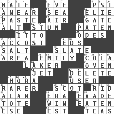 ACROSS 1. Nathan's nickname 5. Night before a holiday 8. Pacific Standard Time (abbr.) 11. Approach 13. Ocean 14. Writer Wiesel 15. Thick mixture 16. Wind 17. Yard entry 18. The first octave above the treble staff 19. Astound 21. Eucharist need 22. "Tell ____ the Marines!" 24. Lyric poems 25. Buttonhole 27. Begley and Asner 29. Table seasoning 30. Schedule 32. Type of rug 33. Poet Dickinson 35. Root beer relative 39. Member of a famous L.A. basketball team 41. Baking chamber 42. Passenger plane 43. Keyboard key 45. Israeli folk dance 48. One who uses or employs something 49. More uncommon 50. Native of Scotland 52. To free from 55. Actor Alda or Thicke 56. Period 57. Dodge 59. Carryall 60. Acquire through effort 61. Consumed 62. Compass dir. 63. Eastern Standard Time (abbr.) 64. Beverages made from leaves DOWN 1. California wine valley 2. Of or related to the anus 3. A testis 4. Consume 5. He sold his birthright 6. Distinctive style or manner 7. Hearing organ 8. Food holder 9. Settings 10. Adolescent 12. Musical pauses 14. Mild oath 20. Small child 21. Mail 23. Add up to 25. White ___ sheet 26. 4-wheeled motor vehicle 27. Pipe bend 28. 24 hours 30. Title for a knight 31. Learning spot: Fr. 33. Supplement with great effort 34. Was introduced to 36. Make much ado about nothing 37. Allow 38. One (Scot) 40. Partly open 43. Superhero pair 44. First name in cosmetics 45. Auras 46. Speak pompously 47. French philosopher Descartes 49. Assign a rank or rating to 50. Indian titles of respect 51. Patter 53. It may be bright or harebrained 54. Habitations of wild animals 56. She-sheep 58. Large container