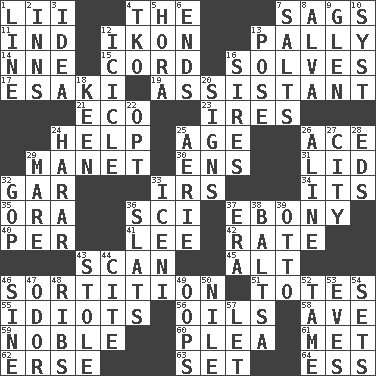 ACROSS 1. Cards in a Roman deck? 4. Definite Article 7. Droops 11. Indiana (abbr.) 12. Image 13. Chummy 14. Compass dir. 15. Drawstring 16. Finds the solution 17. 1973 Nobel Price Winner (Physics) Leo 19. Helper 21. Environmental prefix 23. Angers 24. Aid 25. Mature 26. Adept person 29. French painter Edouard 30. Followers of ems 31. Flaplike covering 32. Slender fish 33. Big collection agency 34. ___ a Wonderful Life 35. Mouth or opening 36. _-fi 37. Black 40. For each 41. Area sheltered from the wind 42. Assign a rank or rating to 43. Examine minutely or intensely 45. The first octave above the treble staff 46. Decision 51. Lugs 55. Foolish or stupid persons 56. Petroleums 58. "___ Maria" 59. Having high moral qualities 60. Entreaty 61. Was introduced to 62. Celtic language 63. Arrange properly for use 64. Curvy letter DOWN 1. Actor's bit 2. Taverns 3. It may be bright or harebrained 4. Ring climax 5. Israeli folk dance 6. Conclusions 7. Table seasonings 8. Inventor's middle name 9. Small, secluded valley 10. System (abbr.) 12. Ice on the eave 13. Introduce or present, as a question 16. Begets 18. Peachy ____! 20. Signals 22. Choose 24. Ethiopian city, capital of Harari 25. Nest on high 26. Place in a line 27. Municipality 28. Begley and Asner 29. Female horse 32. Grand Old Party 33. Ancient Celtic tribe of eastern Britain 36. Narrow boards 37. Period 38. Greek mezzo-soprano Agnes 39. Von Bismarck 43. Took without asking 44. Quote 46. Trig term 47. Scent 48. Teases 49. I made a mistake 50. "Death on the ____" 52. Docile 53. Nights before holidays 54. Arranges properly for use 57. Allow