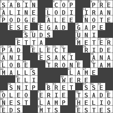ACROSS 1. Unit of acoustic absorption 6. Police officer (slang) 9. Before (prefix) 12. Place in a line 13. Farming town in central California 14. SW Asia republic 15. Puddle 16. Toward shelter 17. Observe 18. Compass dir. 19. Mild oath 20. Yawn 21. Soap bubbles 23. University (slang) 24. Singer James 25. Distance measurement 28. Writing tablet 30. Choose 34. Travel on an animal 35. Black tropical American cuckoo 36. 1973 Nobel Price Winner (Physics) Leo 38. Santa ___, CA 39. Ear part 41. Heavy duty weighing machine 43. Scottish cap 44. Shopping centers 46. Unable to walk 48. Connecticut Ivy Leaguer 49. We are 50. Clip 51. Cy Young winner Saberhagen 53. Compass dir. 56. Butter sub 57. One of the Great Lakes 58. Sadhe (variant) 60. Egg locale 61. Desk light 62. Sun: prefix 63. Begley and Asner 64. Mountains (abbr.) 65. _____ Park, CO DOWN 1. Plant excrement 2. Medicinal plant 3. Auction offers 4. Swallow 5. Born 6. Root beer relative 7. Wrote a lyric poem 8. Sliced dessert 9. Appease 10. Assign a rank or rating to 11. Compass dir. 13. Falls behind 14. Sillier 19. Peak District village in England 20. Chewing product 22. Shoshoni 24. The property of being fit to eat 26. Pulitzer Prize-winning author Ferber 27. 480, 500 or 516 sheets of paper 28. Inside of hand 29. Small Philippine buffalo 31. Eastern Standard Time (abbr.) 32. 4-wheeled motor vehicle 33. Ring climax 37. An arm off of a larger body of water 40. American author Paul (1891-1958) 42. Ewer handle 45. Small drink 47. Makes clutter 49. Shed a tear 50. Downhill vehicle 51. Naughty child 52. Basketball hoops 54. Table seasoning 55. Singer Brickell 56. Single 57. Shade tree 58. Definite Article 59. Greek goddess of the dawn
