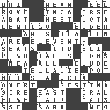 ACROSS 1. RI univ. 4. 480, 500 or 516 sheets of paper 8. Snakelike fish 11. Be footloose 13. South American Indian 14. Celtic language 15. Blind as ____ 16. Rendezvous 17. Globular water bottle used in Asia 18. Small, flat, pigmented spot on the skin 21. A person who is older than you are 22. Ancient Greek god of war 23. Afternoon social gathering 25. Car or cant ending 26. "We ___ not amused" (Victoria) 29. Veterans Day date 32. Theater features 34. It would 35. Biblical high priest 38. Expression of disdain 39. Falsehoods 41. Immeasurably long periods of time 43. Teachers' org. 44. 100% 45. Evade 46. Copy Pinocchio 50. Plant holder 51. Remaining after all deductions 54. Ocean 55. Southern CA. univ. 57. Unconcealed 59. French poetic form 63. The founder of a family 64. Compass direction 67. Spoken 68. Otherwise 69. Den 70. Floor protectors 71. Compass dir. 72. "Two Mules for Sister ____" 73. Modern: prefix DOWN 1. Mountain range 2. Loose flowing garment 3. "Terrible" tsar 4. Full of chinks, cracks, or crevices 5. Compass dir. 6. Adept person 7. Floor covering 8. Wear away 9. First name in cosmetics 10. Memorize 12. Singer James 14. Pipe bend 19. Angers 20. Set 21. Ingest 23. False hair 24. Extremities 26. Viper 27. It's straight from the horse's mouth 28. Comfort 30. Country residence 31. Person who is morally reprehensible 33. Not this but _ 36. Central Nebraska county 37. Southeast Asian peninsula 39. Story 40. Silent film actress Nazimova 42. Put into a specified state 45. Snakelike fish 47. Eastern Standard Time (abbr.) 48. A period of five years 49. Frozen water 51. Olfactory organs 52. Vices 53. Laconic 56. Smallest unit of an element 58. To sift 60. SW Asia republic 61. Nathan's nickname 62. In addition 64. Raised railways 65. American Automobile Association (abbr.) 66. Title for a knight
