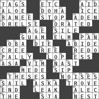 ACROSS 1. Labels 5. And so on (abbr.) 8. Assist 11. _ vera 12. Capital of the state of Qatar 14. Frozen water 15. Indian princess (variant) 17. Halt 18. Arabian gulf 19. Threatening words 21. Spoke pompously 23. Ripen 25. Filth; sediment 26. Island territory of the United States 27. Shade tree 28. Baking dish 31. Chief or king in Benin or Nigeria 33. Pass on 35. Remain 37. Algonquian 38. To sift 40. Do over again 41. Friendly 43. Trim (branches) 45. Double-curved letter 46. White ___ sheet 47. Zeal 50. Political cartoonist Thomas 52. Ancient Persian 53. Small drink 54. College papers 56. Annoying sounds 61. Move on water 62. "____ silly question..." 65. Collection of objects 66. Conclude 67. Path through which fluid escapes 68. Actor Baldwin 69. Definite Article 70. R.R. building 71. Egg locale DOWN 1. Pacific island yam 2. Having or resembling wings 3. Went 4. Stitch closed the eyes of (a falcon) 5. Begley and Asner 6. Small child 7. Opt 8. Assistant 9. On the rocks 10. Lair 13. Showery time 16. He sold his birthright 18. Had dinner 20. Mild oath 22. _ mater 24. Independent ruler or chieftain 26. Highlander 28. Sliced desserts 29. Does sums 30. Modern: prefix 31. Mouths or openings 32. Actor Lugosi 34. Snakelike fish 36. Cy Young winner Saberhagen 37. Tax preparer (abbr.) 39. Immeasurably long periods of time 42. Jacques Cousteau's middle name 44. Ache 48. Standard of perfection 49. Makes clutter 51. Specific locale 52. Cartoonist voice _ Blanc 54. Hyperbolic tangent 55. Flintstone garb 57. SW Asia republic 58. Flatfish 59. Nights before holidays 60. Religious group 61. Arrange properly for use 63. Krazy ___ of comics 64. Alias (abbr.)