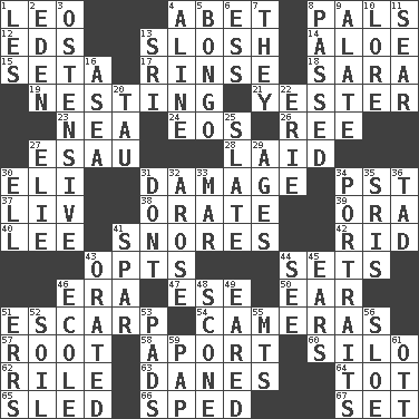 ACROSS 1. Lion 4. Collude with 8. Friends 12. Begley and Asner 13. Agitate, as a liquid 14. Medicinal plant 15. Bristle 17. Wash lightly 18. "Two Mules for Sister ____" 19. Snuggling 21. Of or pertaining to yesterday 23. Teachers' org. 24. Greek goddess of the dawn 26. To riddle 27. Son of Isaac 28. Put down 30. Connecticut Ivy Leaguer 31. Break 34. Pacific Standard Time (abbr.) 37. 54 in ancient Rome 38. Speak pompously 39. Mouth or opening 40. Area sheltered from the wind 41. Sounds asleep 42. To free from 43. Chooses 44. Arranges properly for use 46. Epoch 47. Compass dir. 50. Ewer handle 51. Fortification 54. Devices for capturing images 57. Carrot, for example 58. To the left, to Queeg 60. Grain storage tower 62. Cause heat under the collar 63. Natives or inhabitants of Denmark 64. Small child 65. Downhill vehicle 66. Moved rapidly 67. Put into a specified state DOWN 1. French article 2. Locale of original sin 3. Clearly or manifestly demonstrative 4. Place in a line 5. Beat drum 6. Curvy letter 7. Those things 8. Went by 9. Having winglike extensions 10. Old wives' tales, e.g. 11. Singe 13. Indian title of respect (Mr.) 16. Toward the sea 20. The 19th letter of the Greek alphabet 22. 4th largest of the Great Lakes 25. Chalkboard 27. Writer Wiesel 29. Matures 30. Pipe bend 31. Do not 32. Came up 33. Spoil 34. Likenesses of persons 35. Indian titles of respect 36. Small boy 41. Practice fight 43. Spoke pompously 44. Observe 45. Hearing organs 46. Learning spot: Fr. 48. Biscuitlike quick bread 49. Having ears or earlike features 51. Blunders 52. The visible part of the earth's surface 53. Writing tablets 55. Mountains (abbr.) 56. _ gin 59. Infant food 61. Baseball player Mel
