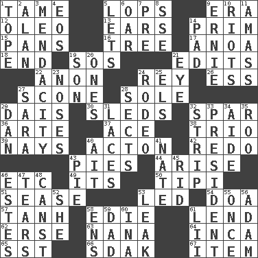 ACROSS 1. Not wild 5. Chops off 9. Epoch 12. Margarine 13. Hearing organs 14. Demure 15. Baking dishes 16. Woody plant 17. Small Philippine buffalo 18. Conclude 19. Mayday 21. Prepares for publication 22. Soon (poet.) 24. Marina Del _, California 26. Curvy letter 27. Biscuitlike quick bread 28. Flatfish 29. Raised platform 30. Bobsleighs 32. Practice fight 36. Johnson of "Laugh-In" 37. Adept person 38. Musical group of three 39. Negative votes 40. 13-14th century defensive garment 42. Make new 43. Sliced desserts 44. Ascend 46. And so on (abbr.) 49. It is 50. Native american tent (variation) 51. Gospel singer Marvin 53. Directed 54. ___ good deed 57. Hyperbolic tangent 58. Singer Brickell 61. Grant temporary use of 62. Celtic language 63. Nanny 64. South American Indian 65. Fast jet (abbr.) 66. Neighbor of Neb. 67. A distinct part DOWN 1. Drink excessively 2. Actor Alda or Thicke 3. Ananias' fault 4. Greek goddess of the dawn 5. Allows 6. Rowing implement 7. Before (prefix) 8. Compass dir. 9. Bert's buddy 10. Disturbances 11. Collect or gather 14. Writing tablet 19. Boy, to dad 20. Washington bills 21. Sight organ 23. Olfactory organs 24. Cowboy competition 25. Raised railways 27. "Two Mules for Sister ____" 28. Religious groups 29. One of the 12 tribes of Israel 31. Shoestrings 32. Remove all contents or possession from 33. Elected leader of a country 34. Helper 35. Friend of Pooh 40. Small island 41. Nathan's nickname 43. Sliced dessert 45. To free from 46. _____ Park, CO 47. Rends 48. 2nd pers. sing. pres. of can (arch.) 52. A female animal or person 53. Path through which fluid escapes 55. At one time in the past 56. First man 58. Followers of ems 59. Male parent 60. _ tizzy (2 wds.) 61. Cards in a Roman deck?