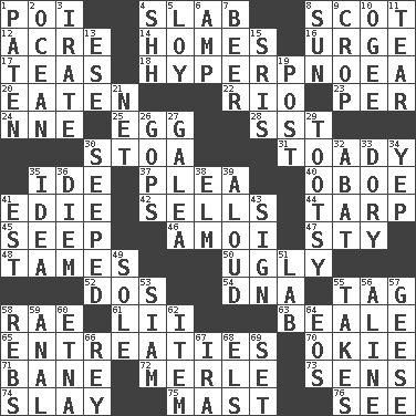 ACROSS 1. Luau course 4. Broad, flat, thick piece 8. Native of Scotland 12. 1/640 square mile 14. Dwellings 16. Goad 17. Afternoon social gatherings 18. Abnormally rapid or deep breathing 20. Consumed 22. River (Sp.) 23. For each 24. Compass dir. 25. Oval reproductive body of a fowl 28. Fast jet (abbr.) 30. Portico 31. Sycophant 35. Binary compound 37. Entreaty 40. Mitch Miller's instrument 41. Singer Brickell 42. Exchanges for money 44. Canvas cover 45. Ooze 46. Mine, in Marseilles 47. Filthy place 48. Makes less strong or intense 50. Repulsive 52. Two (Sp.) 54. Heredity factor (abbr.) 55. Label 58. Actress Charlotte 61. Cards in a Roman deck? 63. Calif. Air Force Base 65. Pleas 70. Migrant worker of the '30s 71. Object of repulsion 72. Haggard of country music 73. Elected reps. 74. Kill 75. Vertical spar for supporting sails 76. Observe DOWN 1. Eucharist need 2. Sea 3. Feeling or showing extreme anger 4. Quiet! 5. Myrna of the movies 6. Electrical Unit 7. Fermented drink made from hops 8. Player for Phoenix 9. Riding implement 10. Double curve, resembling the letter S 11. Separate forcefully 13. Compass dir. 15. Indian titles of respect 19. Mail 21. Fish or hair follower 26. Republicans 27. An organ shaped like a helmet 29. A girl or young woman (variant) 30. Oozed 32. Blind as ____ 33. Small, narrow, flatbottom fishing boat 34. Slangy assent 35. The main thing one is thinking about 36. South Vietnam president (1954) 38. Shade tree 39. Verbally 41. Eastern Standard Time (abbr.) 43. Signal 49. Flatfish 51. Experiment locale 53. Thailand, formerly 55. Proceeds 56. Place in a line 57. Honkers 58. Confederate soldiers (slang) 59. Of or related to the anus 60. Inactive volcano in Sicily 62. A whole individual unit 64. Greek goddess of the dawn 66. Marina Del _, California 67. Lyricist Gershwin 68. Raised railways 69. Put into a specified state