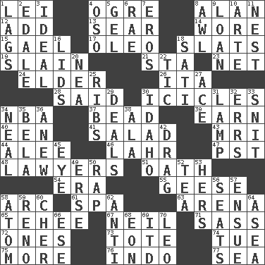 ACROSS 1. Luau accessory 4. Legendary monster 8. Actor Alda or Thicke 12. Say or write further 13. Burn superficially 14. Had on 15. Highlander 17. Butter sub 18. Narrow boards 19. Killed 21. R.R. building 23. Remaining after all deductions 24. A person who is older than you are 26. Call ___ day 28. Stated 30. Winter's stalactites 34. Basketball assoc. 37. Necklace unit 39. Merit 40. Car or cant ending 41. First course 43. Medical imaging device (abbr.) 44. Toward shelter 46. Cowardly lion portrayer 47. Pacific Standard Time (abbr.) 48. Those who practice law 51. Pledge 54. Period 55. Honkers 58. Curve 61. Health resort 63. Sports stadium 65. Giggle 67. Famous astronaut Armstrong 71. Backtalk 72. Singles 73. Carry 74. Third day of the wk. 75. Greater amount 76. _ china 77. Ocean DOWN 1. Fails to keep up a pace 2. Peak District village in England 3. Standard of perfection 4. Bear (Spanish) 5. Set 6. Actress Charlotte 7. Greek god of love 8. Leather borer 9. Grant temporary use of 10. Johnson of "Laugh-In" 11. Egg locale 16. Flaplike coverings 18. Suttee (variant) 20. Teachers' org. 22. Nervous spasm 25. Chest bones 27. Adept person 29. Allots cards 30. Potato state 31. Desk light 32. Blunders 33. In a ____ (agitated or irritated) 34. Be tempered by heat 35. Actor Lugosi 36. Afresh 38. Insect wing 42. To trail on the ground 45. Sight organ 49. Celtic language 50. Hit sharply and swiftly 52. Afternoon social gathering 53. Possessive pronoun 56. Theater features 57. Take place subsequently 58. Tiny particle 59. Western Nevada city 60. "Mermaids" star 62. Against 64. Toward the sea 66. Compass dir. 68. A really long time 69. It would 70. Lion