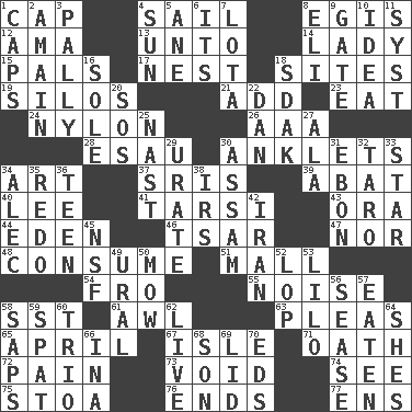 ACROSS 1. Head covering 4. Move on water 8. The front part of a cuirass 12. Nanny (var.) 13. To (old English) 14. Kenny Rogers chart-topper in '80 15. Friends 17. Egg locale 18. Settings 19. Grain storage towers 21. Increase 23. Ingest 24. Thermoplastic polyamide 26. American Automobile Association (abbr.) 28. He sold his birthright 30. Short socks 34. Tate display 37. Indian titles of respect 39. Blind as ____ 40. Area sheltered from the wind 41. Tarsus (plural) 43. Mouth or opening 44. Paradise 46. Russian ruler of old 47. And not 48. Ingest 51. Shopping center 54. From 55. Annoying sound 58. Fast jet (abbr.) 61. Leather borer 63. Entreaties 65. Showery time 67. Small island 71. Pledge 72. Ache 73. Empty area or space 74. Observe 75. Portico 76. Conclusions 77. Followers of ems DOWN 1. Balmoral and tarboosh 2. With great haste 3. Chummy 4. Player for Phoenix 5. A saturated hydrocarbon 6. ___ a Wonderful Life 7. Globular water bottle used in Asia 8. Biblical high priest 9. Yard entry 10. The main thing one is thinking about 11. System (abbr.) 16. Flatfish 18. Neighbor of Neb. 20. Mayday 22. Daniel's nick name 25. Political cartoonist Thomas 27. In the manner of 29. A salt of uric acid 30. Indian state 31. Inky black, to poets 32. Edible starchy tuberous root 33. Play the lead 34. Actor Baldwin 35. Do over again 36. Adolescent 38. Big collection agency 42. SW Asia republic 45. Overdraft (abbr.) 49. Mountain range 50. Cut the grass 52. Trim (branches) 53. _ and Stitch 56. Gospel singer Marvin 57. Eroded 58. Plant excrements 59. Argument over a trivial matter 60. Musical group of three 62. Not recorded 64. "______ My Girl" (Turtles hit) 66. _ tizzy (2 wds.) 68. Male offspring 69. Flaplike covering 70. Begley and Asner