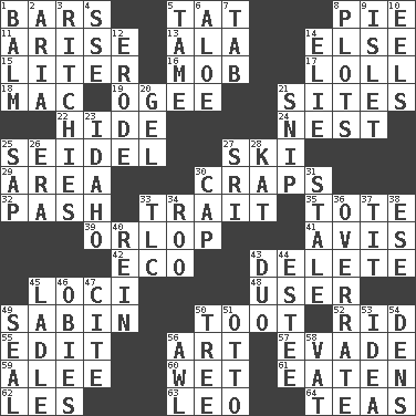 ACROSS 1. Taverns 5. Make lace 8. Sliced dessert 11. Ascend 13. Wing 14. Otherwise 15. 61 cubic inches 16. Crowd into 17. Hang loosely or laxly 18. Big _ 19. Double curve, resembling the letter S 21. Locates 22. Flintstone garb 24. A home for chicks 25. Beer mug 27. What Jean-Claude Killy likes to do 29. Length times width 30. Dice game 32. Romantic infatuation 33. Distinguishing feature 35. Haul 39. Lowest deck of a ship 41. Opinion 42. Environmental prefix 43. Erase 45. Venues 48. One who uses or employs something 49. Unit of acoustic absorption 50. A blast of a horn 52. To free from 55. Prepare for publication 56. Nonscientific branch of learning 57. Dodge 59. Toward shelter 60. Dripping 61. Eroded 62. French article 63. Lion 64. Beverages made from leaves DOWN 1. Lip ointment 2. Operatic vocal solo 3. Actors Guy, Robert Welles, and Clint 4. Compass dir. 5. Not wild 6. _ vera 7. Keyboard key 8. Schemes 9. Small island 10. Snakelike fish 12. Wear away 14. Writer Wiesel 20. Set 21. Sever or remove by pinching or nipping 23. Potato state 25. Plant excrement 26. Epoch 27. Indian title of respect (Mr.) 28. Krazy ___ of comics 30. Head covering 31. Having lost freshness 33. Affectionate concern, for short 34. Friend of Pooh 36. Make much ado about nothing 37. Teat (slang) 38. Compass dir. 40. It's straight from the horse's mouth 43. Superhero pair 44. First name in cosmetics 45. Dipping utensil 46. Off-Broadway awards 47. Quote 49. Lick closed 50. Family _ (genealogy) 51. "Beetle Bailey" pooch 53. The main thing one is thinking about 54. Lairs 56. Leather borer 58. Large container