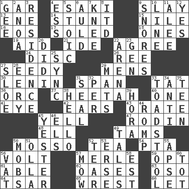 ACROSS 1. Slender fish 4. 1973 Nobel Price Winner (Physics) Leo 9. Kill 13. Compass dir. 14. Difficult or unusual or dangerous feat 15. Mediterranean tributary 16. Greek goddess of the dawn 17. Having a sole or soles 18. Singles 19. Assist 21. Binary compound 22. Match 24. Compact _ 26. To sift 27. Shabby and untidy 29. Not women's 30. Soviet premier 1918-24 31. Connect, as a bridge 33. Make lace 36. The grampus (Milton) 37. Leopard's kin 40. Single 41. Sight organ 42. Hearing organs 43. Declaim 45. Shout 47. "The Thinker" sculptor 48. Pipe bend 49. Scottish caps 50. With motion or animation 52. Beverage made from leaves 54. Parent Teacher Association (abbr.) 56. Electrical Unit 57. Haggard of country music 59. Choose 61. Competent 62. Fertile tracts in a desert 63. Bear (Spanish) 64. Russian ruler of old 65. Obtain by seizing forcibly or violently 66. Allow DOWN 1. Unit of force equal to gravity 2. Small Philippine buffalo 3. Dwelling 4. Double-curved letter 5. Unemotional 6. Old (Scot.) 7. Leg joint 8. It would 9. Sounds asleep 10. Actor's bit 11. Toward shelter 12. Affirmative reply 20. "You Light Up My Life" star Conn 22. Sports stadium 23. Commissioned mil. rank 25. Synchronize (abbr.) 27. A type of plum 28. Suggestive of the supernatural 29. Floor coverings 31. Lick closed 32. For each 33. Inedible or poisonous agaric 34. Opposed to 35. Adolescent 38. Phone greeting 39. Israeli folk dance 44. Play 45. Last 46. Raised railways 49. Lies 50. Disorderly crowds 51. Water jar 52. Lacerate 53. Celtic language 55. Domed church section 56. Large container 57. Cut the grass 58. Eastern Standard Time (abbr.) 60. Small child