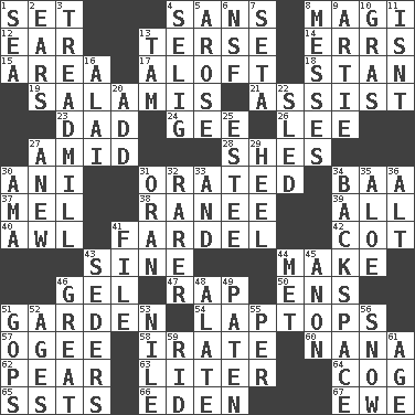 ACROSS 1. Put into a specified state 4. Without 8. Wise men 12. Hearing organ 13. Laconic 14. Blunders 15. Type of rug 17. High up in or into the air 18. Comedian Laurel of Laurel & Hardy 19. Deli grouping 21. Help 23. Male parent 24. Turn to the right 26. Area sheltered from the wind 27. Among 28. "______ My Girl" (Turtles hit) 30. Cuckoo 31. Spoke pompously 34. Sound made by sheep 37. Cartoonist voice _ Blanc 38. Indian princess (variant) 39. Everything 40. Leather borer 41. Burden 42. Small bed 43. Trig term 44. Cause to be 46. Set 47. Strike 50. Followers of ems 51. Place where plants grow 54. Portable computers 57. Double curve, resembling the letter S 58. Feeling or showing extreme anger 60. Nanny 62. Lightbulb-shaped fruit 63. 61 cubic inches 64. Gear tooth 65. Fast planes 66. Genesis locale 67. She-sheep DOWN 1. Ocean 2. Hearing organs 3. Excercise machine 4. Former Milwaukee Brewers owner Bud 5. Came up 6. Science/research agcy. 7. Stalk of a moss capsule 8. Makes clutter 9. Nick name for Arthur 10. Pate de foie ____ 11. Is not 13. Scottish cap 16. Mountain range southwest of Kyrgyzstan 20. Find the sum of 22. Downhill vehicle 25. First name in cosmetics 27. Afresh 29. Person who is morally reprehensible 30. Nanny (var.) 31. NW Algerian seaport 32. More valued for its uncommonness 33. Also 34. Keyboard key 35. Medicinal plant 36. The first octave above the treble staff 41. Do some clerical work 43. Spring feasts 44. Was introduced to 45. At once, immediately (arch.) 46. Relatively large 48. Having winglike extensions 49. Eucharist need 51. Republicans 52. Matures 53. Mediterranean tributary 55. For each 56. Frozen precipitation 59. To free from 61. Mature