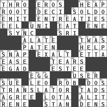 ACROSS 1. Through, poetically 5. Greek god of love 9. Pile 13. Carrot, for example 14. Tenth: prefix 15. Twentieth part of a lira 16. Give off 17. Pleas 19. Snakelike fish 20. Corn or form start 21. Consume 22. Compass dir. 23. Synchronize (abbr.) 25. Indian title of respect (Mr.) 26. Having winglike extensions 30. It was, poetically 34. Eucharist need 35. Assist 36. Fastener 39. Honor 42. Singer James 43. Relaxation 44. Lacerates 46. Mild oath 47. First name in cosmetics 48. Oval reproductive body of a fowl 51. One who uses or employs something 54. Take to court 57. Lion 58. Director Reiner 60. Two (Sp.) 62. Interpreter 65. Small boys 66. Match 67. Globular water bottle used in Asia 68. Set down 69. French philosopher Descartes 70. Comedian Laurel of Laurel & Hardy 71. Habitations of wild animals DOWN 1. Relationship diagram 2. Dwellings 3. Turbulent 4. Baseball player Mel 5. Genesis locale 6. Painter Guido (1575-1642) 7. Sep. follower 8. Fathers 9. Being at a high temperature 10. Writer Wiesel 11. Arabian gulf 12. Introduce or present, as a question 15. Suttee (variant) 18. Hearing organ 20. Southern CA. univ. 24. Slept 27. Had dinner 28. John Ritter's dad 29. Related on the mother's side 30. College papers 31. Dripping 32. The first octave above the treble staff 33. Health resort 36. Observe 37. Tired old horse 38. White ___ sheet 40. French article 41. Make lace 45. Reuben's nickname 48. Otherwise 49. Set 50. Purposes of endeavors 52. Peak District village in England 53. "The Thinker" sculptor 54. Play the lead 55. Goad 56. Merit 58. Round or rotation of duties 59. Northwest Algerian city 61. Fast planes 63. Born 64. Small child 65. Small amount or degree