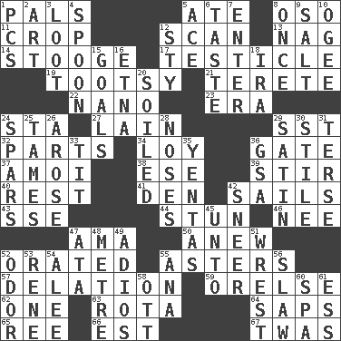 ACROSS 1. Friends 5. Had dinner 8. Bear (Spanish) 11. Riding implement 12. Skim 13. Tired old horse 14. Moe Howard, for one 17. A testis 19. Tootsie (variant) 21. Cigar-shaped 22. Billionth: prefix 23. Period 24. R.R. building 27. (Had) reclined 29. Fast jet (abbr.) 32. Components 34. Myrna of the movies 36. Yard entry 37. Mine, in Marseilles 38. Compass dir. 39. Disorderly outburst 40. Respite 41. Lair 42. Travels by water 43. Compass dir. 44. Surprise greatly 46. Born 47. Nursemaid (var.) 50. Afresh 52. Spoke pompously 55. Michaelmas daisies 57. Accusation by an informer 59. Threatening words 62. Single 63. Round or rotation of duties 64. Plant excrements 65. Portuguese money of account (variant) 66. Eastern Standard Time (abbr.) 67. It was, poetically DOWN 1. Personal Computers (abbr.) 2. Tate display 3. Plunder 4. Soup utensil 5. Adept person 6. Clothes sense 7. Keyboard key 8. At one time in the past 9. Table seasoning 10. Double curve, resembling the letter S 12. Filthy place 15. Finish lines 16. Inactive volcano in Sicily 18. Lyricist Gershwin 20. Dirtied 24. Practice fights 25. Domesticates 26. Came up 28. Olfactory organs 29. Smooth fabric 30. Vertical member of a panel or frame 31. Laconic 33. Teat (slang) 35. Gossips 36. Girls' org. (abbr.) 42. Contemptuous expression 45. To (old English) 47. _ moment's notice (2 wds.) 48. Distance measurement (Brit.) 49. Goodbye (Sp.) 51. Obtain by seizing forcibly or violently 52. Aroma 53. French philosopher Descartes 54. Toward shelter 55. Santa ___, CA 56. Cole _ (cabbage dish) 58. Baseball player Mel 60. Health resort 61. Double-curved letter