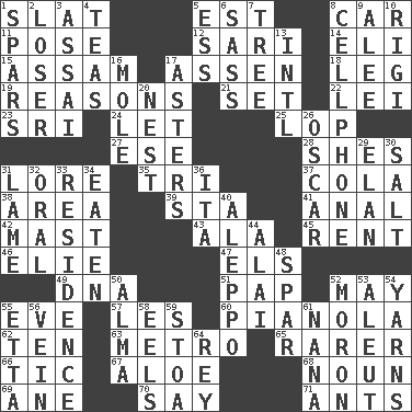 ACROSS 1. Narrow board 5. Eastern Standard Time (abbr.) 8. Auto 11. Introduce or present, as a question 12. Indian skirt 14. Biblical high priest 15. Indian state 17. NE Netherlands city 18. Part of a journey 19. Thinks logically 21. Arrange properly for use 22. Luau accessory 23. _ Lanka 24. Allow 25. Trim (branches) 27. Compass dir. 28. "______ My Girl" (Turtles hit) 31. Old wives' tales, e.g. 35. Three (prefix) 37. Root beer relative 38. Type of rug 39. R.R. building 41. Of or related to the anus 42. Vertical spar for supporting sails 43. According to 45. Monthly bill 46. Writer Wiesel 47. Raised railways 49. Heredity factor (abbr.) 51. Infant food 52. Fifth month 55. First lady 57. French article 60. Player piano 62. Nine, plus one 63. Paris' subway 65. Less widely known 66. Nervous spasm 67. Medicinal plant 68. Part of speech 69. One (Scot) 70. Declare 71. Pismires DOWN 1. Practice fights 2. Failure 3. Slender Brazilian palm 4. Beverages made from leaves 5. Double-curved letter 6. Backtalk 7. Relationship diagram 8. Portable communications device 9. Toward shelter 10. Swiss mountan, "Queen of the Mountains" 13. International (abbr.) 16. Undercover agent 17. Michaelmas daisies 20. Egg locale 26. Witty Wilde 29. Liveliness 30. Table seasoning 31. Unable to walk 32. Taken by mouth 33. Home 34. Consumed 36. Call ___ day 40. City in Syria 44. Jai ____ 48. Coast Guard woman 50. _ mater 52. Person of subnormal intelligence 53. Native American of Southwest Alaska 54. Tall tales 55. Singer James 56. Distinctive style or manner 58. Snakelike fish 59. Portico 61. Nanny 64. Marina Del _, California