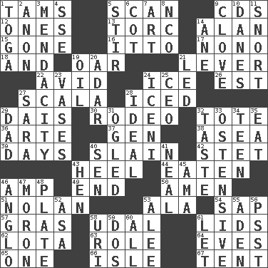 ACROSS 1. Scottish caps 5. Examine hastily 9. Music discs 12. Washington bills 13. Torque (variant) 14. Actor Alda or Thicke 15. Went 16. "Tell ____ the Marines!" 17. Words to Nanette 18. Plus 19. Boat paddle 21. Prying instrument 22. Enthusiastic 24. Frozen water 26. Eastern Standard Time (abbr.) 27. Any of the three canals of the cochlea 28. On the rocks 29. Raised platform 30. Cowboy competition 32. Lug 36. Johnson of "Laugh-In" 37. Commissioned military rank (abbr.) 38. At sea 39. 24-hour periods 40. Killed 42. Proofreading order 43. Person who is morally reprehensible 44. Consumed 46. Electrical Unit 49. Conclusion 50. So be it 51. Pitcher Ryan 53. Insect wing 54. Plant excrement 57. Pate de foie ____ 58. Allodial 61. Flaplike coverings 62. Globular water bottle used in Asia 63. Hero or heavy, e.g. 64. Nights before holidays 65. Single 66. Small island 67. Portable shelter DOWN 1. Ancient Roman robe 2. At once, immediately (arch.) 3. Ananias' fault 4. Compass dir. 5. Agitate 6. Small bed 7. Tate display 8. Non-commissioned officer (abbr.) 9. Garlic unit 10. Natives or inhabitants of Denmark 11. Derisive sound 14. A saturated hydrocarbon 19. Lubricate 20. The sixth month of the Jewish calendar 21. Directed 23. Flower holders 24. Ancient Celtic tribe of eastern Britain 25. Corporate head (abbr.) 27. "Two Mules for Sister ____" 28. Perfect 29. Male parent 31. Stared at amorously 32. Clothes sense 33. Clearly or manifestly demonstrative 34. Adolescent 35. Erode 40. Elected rep. 41. Anneal 43. Layer 45. Wet nurse (var.) 46. White American of non-Hispanic descent 47. Person of subnormal intelligence 48. Food holder 52. White ___ sheet 53. Toward shelter 55. An important port of Yemen 56. Inconspicuous attention getter 58. RI univ. 59. Two (Sp.) 60. Everything 61. Allow