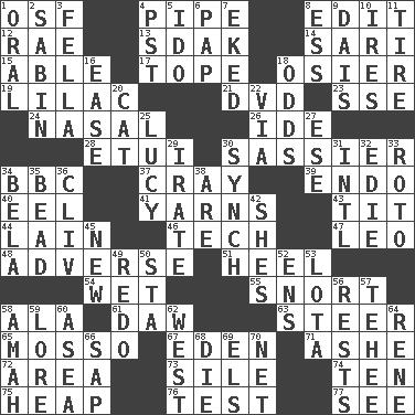 ACROSS 1. Order of Saint Francis (abbr.) 4. Corncob 8. Prepare for publication 12. Actress Charlotte 13. Neighbor of Neb. 14. Indian skirt 15. Competent 17. Drink excessively 18. Flexible twig of a willow tree 19. Pale purple color 21. Movie disc 23. Compass dir. 24. Rhinal 26. Binary compound 28. Needle case 30. More disrespectful 34. English channel? 37. Supercomputer manufacturer 39. Inside; within (prefix) 40. Snakelike fish 41. Tall tales 43. Teat (slang) 44. (Had) reclined 46. Technology 47. Lion 48. Contrary to your interests or welfare 51. Person who is morally reprehensible 54. Dripping 55. Derisive sound 58. In the manner of 61. Fool 63. Navigate 65. With motion or animation 67. Genesis locale 71. American tennis player Robert 72. Length times width 73. Filth; sediment 74. "___ Little Indians" 75. Pile 76. Trial 77. Perceive with the eye DOWN 1. Taken by mouth 2. Unit of acoustic absorption 3. Man or boy (slang) 4. Pacific Standard Time (abbr.) 5. Wedding promise 6. Infant food 7. Supplemented with great effort 8. Double-curved letter 9. Raised platform 10. Angers 11. Hoop that covers a wheel 16. Comfort 18. Probability 20. Domesticated feline 22. By way of 25. "I Love _" 27. Compass dir. 29. Feeling or showing extreme anger 30. Synchronize (abbr.) 31. International (abbr.) 32. Singer Brickell 33. Printing process, for short 34. Actor Lugosi 35. Necklace unit 36. 154 in Roman numerals 38. "We ___ not amused" (Victoria) 42. "______ My Girl" (Turtles hit) 45. ___ Haven, CT 49. Redecorate 50. R.R. building 52. Followers of ems 53. Globular water bottle used in Asia 56. Musical pauses 57. Giggle 58. Nanny 59. Old wives' tales, e.g. 60. Toward the sea 62. Compass direction 64. French philosopher Descartes 66. Plant excrement 68. Expire 69. Raised railways 70. Fish or hair follower
