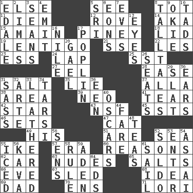 ACROSS 1. Otherwise 5. Observe 8. Small child 11. South Vietnam president (1954) 12. Be footloose 14. Alias (abbr.) 15. At full speed 17. Abounding in pines 18. Hat (slang) 19. Small, flat, pigmented spot on the skin 21. Compass dir. 22. French article 23. Double-curved letter 24. Infant locale 25. Fast jet (abbr.) 27. Snakelike fish 28. Relaxation 31. Table seasoning 35. Whopper 37. Silent film actress Nazimova 38. Length times width 39. Modern: prefix 41. Rend 42. Play the lead 43. Overdraft (abbr.) 45. Fast planes 46. Arranges properly for use 47. Feline 49. Part of HMS, perhaps 51. "We ___ not amused" (Victoria) 52. Ocean 55. D.D.E's nickname 57. Period 60. Thinks logically 62. Automobile 63. Unclothed pictures 65. Table seasonings 66. Night before a holiday 67. Downhill vehicle 68. The content of cognition 69. Male parent 70. Followers of ems 71. Australian parrot (variant) DOWN 1. Peak District village in England 2. Citrus fruits 3. Seines 4. Send forth 5. Indian title of respect (Mr.) 6. Immeasurably long periods of time 7. Nights before holidays 8. Baron Munchausen's specialties 9. Migrant worker of the '30s 10. Small boys 13. Sight organs 16. "Death on the ____" 17. Cotton for raincoats, e.g. 20. Highlander 26. Theater features 29. Narrow board 30. Hearing organs 31. Backtalk 32. Johnson of "Laugh-In" 33. Resembling or made to resemble leather 34. Tarsus (plural) 36. Car or cant ending 40. Motion picture awards 44. Conductor's collection 48. Beverages made from leaves 50. Elected reps. 52. Twentieth part of a lira 53. Keyboard key 54. Slender Brazilian palm 55. On the rocks 56. Polynesian shrub of the pepper family 58. General guideline 59. Arabian gulf 61. Travel by water 64. Begley and Asner