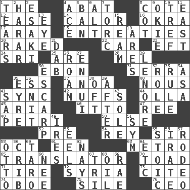 ACROSS 1. Definite Article 4. Blind as ____ 8. ____ d'Azur (French Riviera) 12. Relaxation 14. Bodily heat indicating an inflammation 16. Gumbo ingredient 17. Like ___ of sunshine 18. Pleas 20. Swept the length of 22. 4-wheeled motor vehicle 23. Newt 24. Indian title of respect (Mr.) 25. "We ___ not amused" (Victoria) 28. Cartoonist voice _ Blanc 30. Inky black, to poets 31. Father Junipero _ 35. Curvy letter 37. Small Philippine buffalo 40. Horse sense 41. Synchronize (abbr.) 42. Bungles 44. Water jar 45. Roberta Peters solo 46. "Tell ____ the Marines!" 47. To riddle 48. _ dish (used to culture cells) 50. Otherwise 52. Before (prefix) 54. Marina Del _, California 55. Title for a knight 58. Sep. follower 61. Car or cant ending 63. Paris' subway 65. Interpreter 70. Frog relative 71. Become fatigued 72. Damascus' land 73. Quote 74. Mitch Miller's instrument 75. Filth; sediment 76. Corporate head (abbr.) DOWN 1. Rends 2. Ethiopian city, capital of Harari 3. 1973 Nobel Price Winner (Physics) Leo 4. Adept person 5. Bar 6. Keyboard modifier key 7. Torque (variant) 8. Small bed 9. Migrant worker of the '30s 10. Not kosher 11. 90 degrees 13. Sight organ 15. 480, 500 or 516 sheets of paper 19. Ancient Greek god of war 21. Pat or tap gently 26. Wander 27. World-weariness 29. Poe poem 30. Fortification 32. Hero or heavy, e.g. 33. General guideline 34. White ___ sheet 35. Jane of fiction 36. In a ____ (agitated or irritated) 38. Often (poetically) 39. Following 41. Plant excrement 43. Not divided or shared with others 49. Angers 51. Symbol (abbr.) 53. Snakelike fish 55. Unemotional 56. Feeling or showing extreme anger 57. Cowboy competition 58. Von Bismarck 59. Baby bed with high sides 60. Pacific island yam 62. Negative votes 64. And so on (abbr.) 66. Born 67. Three (prefix) 68. Petroleum 69. Actress Charlotte
