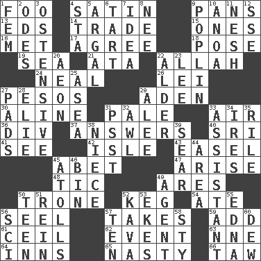 ACROSS 1. Egg _ yung 4. Smooth fabric 9. Baking dishes 13. Begley and Asner 14. Exchange 15. Washington bills 16. Was introduced to 17. Match 18. Airs 19. Ocean 21. _ moment's notice (2 wds.) 22. Assad's deity 24. Be tempered by heat 26. Luau accessory 27. Mexican monetary units 29. Arabian gulf 30. Place in a line 31. Light colored 33. Atmosphere 36. HTML Container Element 37. Replies 40. _ Lanka 41. Perceive with the eye 42. Capri or Wight 43. Artist's stand 45. Collude with 47. Ascend 48. Nervous spasm 49. Ancient Greek god of war 50. Marketplace scale 52. Cask 54. Had dinner 56. Stitch closed the eyes of (a falcon) 57. Receives possession of 59. Say or write further 61. To provide with a ceiling 62. Incident 63. Compass dir. 64. Lodging establishments 65. Smutty 66. The 23rd letter of the Hebrew alphabet DOWN 1. Opposite of masc. 2. Lyric poems 3. Clearly or manifestly demonstrative 4. R.R. building 5. Therefore, facetiously 6. Small pie 7. The main thing one is thinking about 8. Born 9. Cotton for raincoats, e.g. 10. Small Philippine buffalo 11. Tender 12. Compass dir. 20. Period of immesurable duration 22. Tree or shrub in the Birch family 23. Area sheltered from the wind 25. Toward the sea 27. Groovy apts. 28. Writer Wiesel 29. Toward shelter 31. Inconspicuous attention getter 32. Leather borer 33. Helper 34. Angers 35. Cause heat under the collar 38. Sibling's daughter 39. Scorch 44. Type of rug 45. Ringlike coral islands and reefs 46. Storage container 49. Rep 50. Adolescent 51. It's straight from the horse's mouth 52. Polynesian shrub of the pepper family 53. Makes supply last 55. Pulitzer Prize-winning author Ferber 56. _-fi 57. Nine, plus one 58. Filthy place 60. Morning condensation