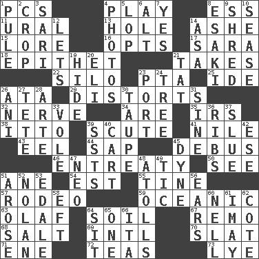 ACROSS 1. Personal Computers (abbr.) 4. Shaw product 8. Curvy letter 11. Mountain range 13. Opening into or through something 14. American tennis player Robert 15. Old wives' tales, e.g. 16. Elects 17. "Two Mules for Sister ____" 18. Curse 21. Receives possession of 22. Grain storage tower 23. Parent Teacher Assoc. 25. Binary compound 26. _ moment's notice (2 wds.) 29. What propaganda does 32. Impudent aggressiveness 34. "We ___ not amused" (Victoria) 35. Big collection agency 38. "Tell ____ the Marines!" 39. Turtle shell scale 41. "Death on the ____" 43. Snakelike fish 44. Plant excrement 45. Alight from a bus 46. Plea 50. Perceive with the eye 51. One (Scot) 54. Eastern Standard Time (abbr.) 55. Prong on a fork 57. Cowboy competition 59. Pertaining to the sea 63. Norwegian king 64. The visible part of the earth's surface 67. San ____ (Riviera town) 68. Table seasoning 69. International (abbr.) 70. Narrow board 71. Compass dir. 72. Afternoon social gatherings 73. Potassium hydroxide DOWN 1. Whine 2. Riding implement 3. Indian skirt 4. Pictures 5. Chop off 6. The first octave above the treble staff 7. It is so 8. 1973 Nobel Price Winner (Physics) Leo 9. Tear up 10. Gospel singer Marvin 12. Allows 14. White ___ sheet 19. Flintstone garb 20. Connecticut Ivy Leaguer 21. Make lace 23. Sweet dark-red dessert wine 24. Family _ (genealogy) 26. Black tropical American cuckoo 27. Wig 28. Johnson of "Laugh-In" 30. Grayish beige 31. Trig term 33. Grand slam 36. Chest bones 37. Change direction abruptly 39. Fast planes 40. Heavy open wagon 42. Compass dir. 45. Unit of force 47. Modern: prefix 48. Ringlike coral islands and reefs 49. Nervous spasm 51. Came up 52. Pitcher Ryan 53. Peak District village in England 56. Hearing organs 58. Lizard (obsolete) 60. 1994 drama film starring Jodie Foster 61. "If ____ say so..." 62. ____ d'Azur (French Riviera) 64. Be seated 65. Single 66. Call ___ day