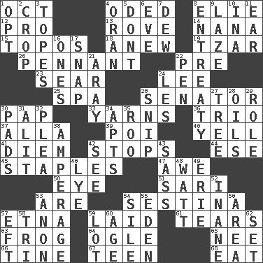 ACROSS 1. Sep. follower 4. Wrote a lyric poem 8. Writer Wiesel 12. Adept person 13. Be footloose 14. Grandmother 15. Traditional theme or motif 18. Afresh 19. Russian ruler 20. Pre-World Series prize 22. Before (prefix) 23. Singe 24. Area sheltered from the wind 25. Health resort 26. Legislator 30. Infant food 33. Entertaining tales 36. Musical group of three 37. Silent film actress Nazimova 39. Luau course 40. Shout 41. South Vietnam president (1954) 42. Closes up, plugs up 44. Compass dir. 45. Paper fasteners 47. Deep reverence 50. Sight organ 51. Indian skirt 53. "We ___ not amused" (Victoria) 54. French poetic form 57. Inactive volcano in Sicily 59. Put down 61. Lacerates 63. Tree-dwelling hopper 64. Stare 65. Born 66. Prong on a fork 67. Adolescent 68. Ingest DOWN 1. Choose 2. Riding implement 3. Drinks excessively 4. Northwest Algerian city 5. Do not 6. First lady 7. Morning condensation 8. Plea 9. Goldbrick 10. _ tizzy (2 wds.) 11. Ewer handle 16. Washington bills 17. Fastener 21. Like ___ of sunshine 22. Writing instrument 24. French article 26. Clip 27. Woody plant 28. Petroleums 29. Hero or heavy, e.g. 30. Groovy apts. 31. Came down and settled, as after flight 32. Entreaty 34. Flats, for short 35. Friend of Pooh 38. Electrical Measurement 42. Observe 43. Backtalk 46. Potassium hydroxide 48. Electrical Unit 49. 4th largest of the Great Lakes 52. Lacking in sense or substance 53. Soon (poet.) 54. Filth; sediment 55. Genesis locale 56. Length times width 57. Newt 58. Three (prefix) 59. Car dealer's back yard 60. Personal question 62. Put into a specified state
