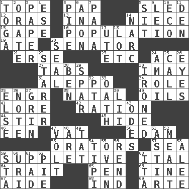 ACROSS 1. Drink excessively 5. Infant food 8. Downhill vehicle 12. Mouths or openings 13. _ tizzy (2 wds.) 14. Sibling's daughter 15. Open wide 16. Census information 19. Had dinner 20. Elected representative 21. Celtic language 23. And so on (abbr.) 24. Adept person 27. Bar bills 30. "If ____ say so..." 31. City in Syria 34. Hero or heavy, e.g. 35. Engineer (abbr.) 38. Brizilian seaport 40. Lubricates 41. Old wives' tales, e.g. 42. Food allowance for one day 44. Agitate 45. Flintstone garb 46. Car or cant ending 47. Large container 50. Dutch treat 53. Speakers 57. Ocean 59. Supplementary 63. Slanted text style (abbr.) 64. Distinguishing feature 65. Animal enclosure 66. Prong on a fork 67. Helper 68. Working for oneself (abbr.) 69. Johnson of "Laugh-In" DOWN 1. Ancient Roman robe 2. Speak pompously 3. Some stationery 4. Compass dir. 5. Corncob 6. At once, immediately (arch.) 7. Dad 8. Be seated 9. Luau accessory 10. Environmental prefix 11. Lair 14. Drug cop 17. Shoshoni 18. Car dealer's back yard 20. Lick closed 22. A viewer who gazes fixedly 24. Mine, in Marseilles 25. Give a ring to 26. Snake ____ (dice throw) 28. Benjamin's nick name 29. Coast Guard woman 30. Pressed 32. Parent Teacher Association (abbr.) 33. Pledge 35. Otherwise 36. Short letter 37. Broad smile 39. Cards in a Roman deck? 43. Lyric poems 47. Electrical Unit 48. "We ___ not amused" (Victoria) 49. Make lace 51. Being in motion 52. Intended 54. Native american tent (variation) 55. Baking chamber 56. Tear apart 58. Toward shelter 59. R.R. building 60. RI univ. 61. Writing tablet 62. Sliced dessert 63. Call ___ day