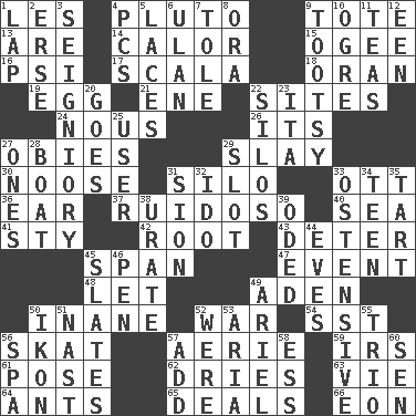 ACROSS 1. French article 4. Greek god of the underworld 9. Lug 13. "We ___ not amused" (Victoria) 14. Bodily heat indicating an inflammation 15. Double curve, resembling the letter S 16. Air pressure measure (abbr.) 17. Any of the three canals of the cochlea 18. Northwest Algerian city 19. Ovum 21. Compass dir. 22. Settings 24. Horse sense 26. It is 27. Off-Broadway awards 29. Kill 30. Trap for birds or small mammals 31. Grain storage tower 33. Baseball player Mel 36. Ewer handle 37. Boisterous (Brazilian Portuguese) 40. Ocean 41. Filthy place 42. Carrot, for example 43. Prevent from occurring 45. Connect, as a bridge 47. Happening 48. Allow 49. An important port of Yemen 50. Silly 52. Armed conflict 54. Fast jet (abbr.) 56. Three-handed card game 57. Nest on high 59. Big collection agency 61. Introduce or present, as a question 62. Frees from moisture 63. Compete 64. Pismires 65. Allots cards 66. A really long time DOWN 1. Pet locale 2. Celtic language 3. Signiory (variant) 4. Personal Computers (abbr.) 5. Shoestrings 6. Uhlan (variant) 7. Lacquered or enameled metalware 8. Mouth or opening 9. A girl or young woman (variant) 10. Legendary monster 11. Beverages made from leaves 12. Car or cant ending 20. Moves 22. Grain storage towers 23. Call ___ day 25. One who uses or employs something 27. Singles 28. Water vessel 29. Narrow, elongated depression 31. The Jewish people; Israel 32. Wedding promise 33. Clearly or manifestly demonstrative 34. Adolescent 35. Small pie 38. A salt of uric acid 39. Wrote a lyric poem 44. Nights before holidays 45. Chalkboards 46. Fenced enclosure 49. Satellite of Uranus 50. Visual representation of an object 51. Political cartoonist Thomas 52. Past tense of be (plural) 53. Operatic vocal solo 55. Musical group of three 56. Health resort 57. Find the sum of 58. Curvy letter 60. Elected rep.