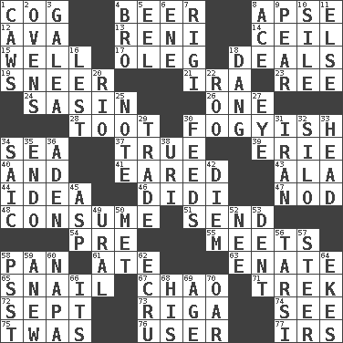 ACROSS 1. Gear tooth 4. Fermented drink made from hops 8. Domed church section 12. Actress Gardner 13. Painter Guido (1575-1642) 14. To provide with a ceiling 15. Not ill 17. Cassini of fashion 18. Allots cards 19. Scornful expression 21. Lyricist Gershwin 23. To riddle 24. Indian antelope 26. Single 28. A blast of a horn 30. Out of fashion; old fashioned 34. Ocean 37. Loyal 39. One of the Great Lakes 40. Plus 41. Having ears or earlike features 43. Wing 44. The content of cognition 46. "You Light Up My Life" star Conn 47. Dreamland 48. Ingest 51. Transmit 54. Before (prefix) 55. Confronts 58. Baking dish 61. Had dinner 63. Related on the mother's side 65. Slow-paced one 67. US Secretary of Labor Elaine L. _ 71. Long journey 72. Back-to-school mo. 73. Capital of Latvia 74. Perceive with the eye 75. It was, poetically 76. One who uses or employs something 77. Big collection agency DOWN 1. Crow sounds 2. Baking chambers 3. An organ shaped like a helmet 4. Sis' sibling 5. Snakelike fish 6. Compass dir. 7. Swiss mountan, "Queen of the Mountains" 8. Adept person 9. Lightbulb-shaped fruit 10. Filth; sediment 11. Otherwise 16. For fear that 18. Mild oath, euphamism for damn 20. River (Sp.) 22. Friend of Pooh 25. Brief written record 27. Sight organ 29. Barter 30. Eats 31. SW Asia republic 32. Grain storage tower 33. Froth on beer 34. Ketch in the Levant 35. Inside; within (prefix) 36. Arabian gulf 38. RI univ. 42. South Vietnam president (1954) 45. Cleo's killer 49. Mountain range 50. Was introduced to 52. Born 53. Gouge 56. Tarsus (plural) 57. Guide 58. Inconspicuous attention getter 59. Afresh 60. California wine valley 62. Shade of tan 64. Makes supply last 66. It is 68. Part of HMS, perhaps 69. Personal question 70. Boat paddle