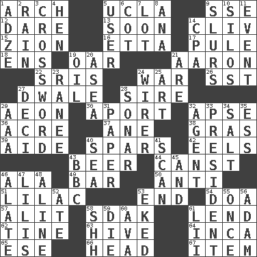 ACROSS 1. Bowlike part 5. Southern CA. univ. 9. Compass dir. 12. Have the gumption 13. Within a short period 14. 154 in Roman numerals 15. The Jewish people; Israel 16. Singer James 17. Whimper 18. Followers of ems 19. Boat paddle 21. Composer Copland 22. Indian titles of respect 24. Armed conflict 26. Fast jet (abbr.) 27. A sleeping potion; an opiate (poet.) 28. Title for a man of rank and authority 29. A really long time 30. To the left, to Queeg 32. Domed church section 36. Land measure 37. A saturated hydrocarbon 38. Pate de foie ____ 39. Assistant 40. Practice fights 42. Snakelike fish 43. Fermented drink made from hops 44. 2nd pers. sing. pres. of can (arch.) 46. Wing 49. Drinking establishment 50. Against 51. Pale purple color 53. Conclusion 54. ___ good deed 57. Came down and settled, as after flight 58. Neighbor of Neb. 61. Grant temporary use of 62. Prong on a fork 63. Hub of activity 64. South American Indian 65. Compass dir. 66. Froth on beer 67. Detail DOWN 1. Edge tool used to cut and shape wood 2. Water falling in drops from the sky 3. What you're doing now 4. Layer 5. One who makes use of a thing 6. Small bed 7. Car dealer's back yard 8. Santa ___, CA 9. Plays smoothly or legato 10. Grain storage towers 11. Happening 14. Numbers guy (abbr.) 19. Lubricate 20. At sea 21. "We ___ not amused" (Victoria) 23. The wife of a rajah (variant) 24. One who wires 25. Nonscientific branch of learning 27. Tenth: prefix 28. Underwater navigation system 29. American Automobile Association (abbr.) 31. Some stationery 32. Rep 33. Elected leader of a country 34. Table seasoning 35. Double-curved letter 40. Ocean 41. Examine hastily 43. English channel? 45. Also 46. Having winglike extensions 47. Ms. Damita and namesakes 48. Place in a line 52. Had dinner 53. Supplemented with great effort 55. At one time in the past 56. First man 58. Quiet! 59. Pass on 60. Actress Gardner 61. Cards in a Roman deck?