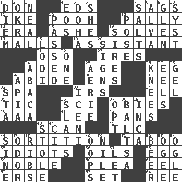 ACROSS 1. Spanish title 4. Begley and Asner 7. Settles 11. D.D.E's nickname 12. "Silly old bear" 13. Friendly 14. Epoch 15. American tennis player Robert 16. Finds the solution 17. Shopping centers 19. Aide 21. Bear (Spanish) 23. Angers 24. Arabian gulf 25. Ripen 26. Cask 29. Stay 30. Followers of ems 31. Born 32. Health resort 33. Big collection agency 34. Pipe bend 35. Nervous spasm 36. _-fi 37. Off-Broadway awards 40. Auto club (abbr.) 41. Area sheltered from the wind 42. Zero-star reviews 43. Skim 45. Affectionate concern, for short 46. Conclusion 51. Off limits 55. Foolish or stupid persons 56. Petroleums 58. Oval reproductive body of a fowl 59. Having high moral qualities 60. Entreaty 61. Snakelike fish 62. Celtic language 63. Put into a specified state 64. To sift DOWN 1. South Vietnam president (1954) 2. Gumbo ingredient 3. Actress Patricia 4. Greek goddess of the dawn 5. Capital of the state of Qatar 6. "______ My Girl" (Turtles hit) 7. Table seasonings 8. Inventor's middle name 9. Small, secluded valley 10. System (abbr.) 12. Went by 13. Airs 16. Fathers 18. Farming town in central California 20. Public displays of written messages 22. Single 24. Phillipine bananalike plant 25. Nest on high 26. Leg joints 27. Snakelike fish 28. Set 29. Capital of Western Samoa 32. R.R. building 33. Ancient Celtic tribe of eastern Britain 36. Narrow boards 37. Choose 38. Greek mezzo-soprano Agnes 39. South American Indian 43. Took without asking 44. Quote 46. Trig term 47. Aroma 48. Chest bones 49. I made a mistake 50. The longest river in the world 52. Fermented drink made from hops 53. Double curve, resembling the letter S 54. Stare at amorously 57. Allow