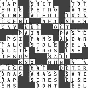 ACROSS 1. Atlas unit 4. Stricken, poetically 8. Small child 11. 4th largest of the Great Lakes 13. Stone: prefix 15. One (Scot) 16. Trig term 17. Native American of Southwest Alaska 18. South American Indian 19. Ancient Celtic tribe of eastern Britain 21. Was introduced to 22. "______ My Girl" (Turtles hit) 23. Island 24. Compass dir. 27. Sep. follower 29. Ache 30. Thick mixture 34. Air pressure measure (abbr.) 36. Baking dishes 39. Approach 40. Baby powder 41. Took without asking 43. Actor Lugosi 44. Having winglike extensions 46. Greek god of love 47. Purpose 48. To get out of a bus 49. Travel by water 51. Acura sports coupe 53. Attila the _ 54. R.R. building 57. Louse (plural) 60. Floor protector 63. Prevent from occurring 65. Mouths or openings 66. Collect or gather 69. Indian skirt 70. Reproach for some lapse or misdeed 71. Founders of families 72. Otherwise 73. Followers of ems 74. Do not 75. Snakelike fish DOWN 1. Mesonic 2. N. Chile seaport 3. Abounding in pines 4. Health resort 5. Cartoonist voice _ Blanc 6. Detail 7. Loyal 8. Hyperbolic tangent 9. Single time 10. Afternoon social gatherings 12. Car or cant ending 14. Von Bismarck 18. Byzantium, centuries later 20. _ tizzy (2 wds.) 25. Pinches, bites 26. Maternal 28. Tax preparer (abbr.) 29. Photos 31. Observes 32. Falsehood 33. Period 34. Light colored 35. Broad, flat, thick piece 37. Not either 38. Splash clumsily 40. Small amount or degree 42. He sold his birthright 45. Double-curved letter 50. Indiana (abbr.) 52. Dec. holiday 54. Showing deterioration from age 55. Laconic 56. Satellite of Uranus 57. Old wives' tales, e.g. 58. SW Asia republic 59. Balmoral and tarboosh 61. Among 62. Edible starchy tuberous root 64. Compass dir. 67. Elected rep. 68. Fast jet (abbr.)