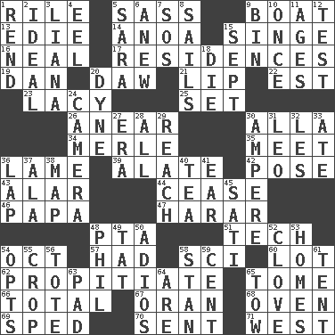 ACROSS 1. Cause heat under the collar 5. Backtalk 9. Water vessel 13. Singer Brickell 14. Small Philippine buffalo 15. Burn superficially 16. Anneal 17. Dwellings 19. Daniel's nick name 20. Fool 21. Mouth edge 22. Eastern Standard Time (abbr.) 23. Made of lace 25. Arrange properly for use 26. Approach 30. Silent film actress Nazimova 34. Haggard of country music 35. Rendezvous 36. Unable to walk 39. Having winglike extensions 42. Airs 43. Having or resembling wings 44. Desist 46. Dad 47. Ethiopian city, capital of Harari 48. Parent Teacher Association (abbr.) 51. Georgia ____ (Atlanta school) 54. Sep. follower 57. Possessed 58. _-fi 60. Car dealer's back yard 62. Conciliate 65. Heavy book 66. "_____ Recall" 67. NW Algerian seaport 68. Baking chamber 69. Drove too fast 70. Posted 71. 270 degrees DOWN 1. Tear apart 2. Perfect 3. Climbing, woody, usually tropical vines 4. Snakelike fish 5. "Two Mules for Sister ____" 6. Afresh 7. Distress signal 8. Moves on water 9. Storage container 10. Single time 11. Grows older 12. Trial 15. Back-to-school mo. 18. Expire 20. Centimeter-gram-second unit of force 24. Device for capturing images 27. Epoch 28. 100% 29. Arrive at 30. Electrical Unit 31. Lion 32. French article 33. Had dinner 36. Pet locale 37. In the manner of 38. Atlas unit 40. Afternoon social gathering 41. Hearing organ 45. Suttee (variant) 48. Silvers or Donahue 49. Make lace 50. Goodbye (Sp.) 52. Garlic unit 53. Residences 54. Chooses 55. Riding implement 56. Haul 58. Comedian Laurel of Laurel & Hardy 59. Penny 61. Portable shelter 63. Writing tablet 64. "We ___ not amused" (Victoria) 65. Pull behind