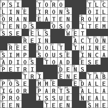 ACROSS 1. Air pressure measure (abbr.) 4. "Corrida" creature 8. Affectionate concern, for short 11. Actor's bit 13. Removes the wrinkles 15. Lubricate 16. Northwest Algerian city 17. Eroded 18. Be footloose 19. Watches over 21. Bear (Spanish) 22. A distinct part 23. Compass dir. 24. Raised railways 27. Dripping 29. It's straight from the horse's mouth 30. 13-14th century defensive garment 34. To sift 36. Stupid person 39. One or ones belonging to thee 40. Simple or foolish person 41. Boozer 43. South American Indian 44. Goodbye (Sp.) 46. Frog relative 47. Compass dir. 48. _ dish (used to culture cells) 49. Habitations of wild animals 51. Three (prefix) 53. Compass dir. 54. Bar bill 57. Airs 60. Madame (abbr.) 63. Peak District village in England 65. Composer Stravinsky 66. Pieces 69. Silent film actress Nazimova 70. Adept person 71. Come out of 72. Actress Patricia 73. Car or cant ending 74. Adolescent 75. A female animal or person DOWN 1. Small pieces of grounds 2. Fathers 3. Empty; void 4. Neckwear 5. Mouth or opening 6. Printing process, for short 7. Washington bills 8. A blast of a horn 9. Moving, as bait 10. Clement's nick name 12. Conclude 14. Overwhelm 18. Actors Guy, Robert Welles, and Clint 20. Observe 25. Flaplike coverings 26. Snob 28. Consume 29. News announcer 31. Canisters 32. At one time in the past 33. Teachers' org. 34. Travel on an animal 35. Send forth 37. Nilotic language 38. Sadhe (variant) 40. Plant excrement 42. Locale of original sin 45. Title for a knight 50. Born 52. Body of Kaffir warriors 54. Lies 55. Assad's deity 56. Memphis, Tenn. Street 57. Corncob 58. Legendary monster 59. Within a short period 61. Vertical spar for supporting sails 62. Celtic language 64. One of the 12 tribes of Israel 67. Third day of the wk. 68. Elected rep.