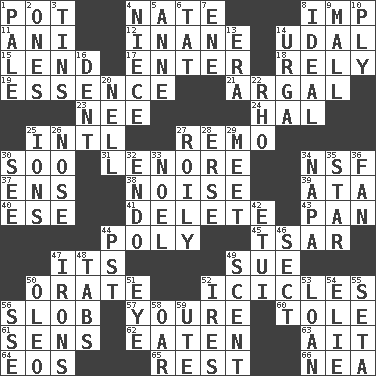 ACROSS 1. Cooking vessel 4. Nathan's nickname 8. Naughty child 11. Cuckoo 12. Silly 14. Allodial 15. Grant temporary use of 17. Keyboard key 18. Trust 19. Center 21. Therefore, facetiously 23. Born 24. Actor Linden 25. International (abbr.) 27. San ____ (Riviera town) 30. "Barney Miller" actor Jack 31. Poe poem 34. Overdraft (abbr.) 37. Followers of ems 38. Annoying sound 39. "One Day ___ Time" 40. Compass dir. 41. Erase 43. Baking dish 44. Much (prefix) 45. Russian ruler of old 47. It is 49. Institute legal proceedings 50. Declaim 52. Winter's stalactites 56. Messy guy 57. You are 60. Lacquered or enameled metalware 61. Elected reps. 62. Eroded 63. Small island 64. Greek goddess of the dawn 65. Repose 66. Teachers' org. DOWN 1. Diluted with white 2. Singles 3. Metal containers 4. Sibling's daughter 5. Singer Murray 6. Make lace 7. Compass dir. 8. Perfect 9. Promenade 10. Apply oneself diligently 13. Epoch 14. Capital and largest city of Mongolia 16. Gouge 20. 1994 drama film starring Jodie Foster 22. 17th letter of the Greek alphabet 25. Charged atoms 26. Olfactory organ 27. Agitated, as a liquid 28. Celtic language 29. Confront 30. Perceive with the eye 32. Inside; within (prefix) 33. Christmas carol 34. California wine valley 35. Play the lead 36. Air blower 42. Needle case 44. Pacific Standard Time (abbr.) 46. Religious group 47. Removes the wrinkles 48. Bar bills 49. Odor 50. Margarine 51. Sight organ 52. Angers 53. Grant temporary use of 54. Writer Wiesel 55. Bristle 56. Compass dir. 58. Rowing implement 59. Shoshoni