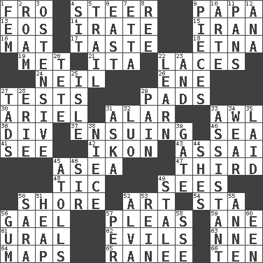 ACROSS 1. Back 4. Guide 9. Dad 13. Greek goddess of the dawn 14. Feeling or showing extreme anger 15. SW Asia republic 16. Floor protector 17. Clothes sense 18. Inactive volcano in Sicily 19. Was introduced to 21. Call ___ day 22. Shoestrings 24. Famous astronaut Armstrong 26. Compass dir. 27. Trials 29. Groovy apts. 30. Satellite of Uranus 31. Having or resembling wings 33. Leather borer 36. HTML Container Element 37. Taking place subsequently 40. Ocean 41. Observe 42. Visual representation of an object 43. Slender Brazilian palm 45. At sea 47. One of three equal parts 48. Nervous spasm 49. Perceives with the eye 50. Dinah or Pauly 52. Nonscientific branch of learning 54. R.R. building 56. Highlander 57. Entreaties 59. One (Scot) 61. Mountain range 62. Vices 63. Compass dir. 64. Atlas contents 65. Indian princess (variant) 66. "___ Little Indians" DOWN 1. Opposite of masc. 2. Wander aimlessly 3. Clearly or manifestly demonstrative 4. Be seated 5. Lag or linger behind 6. 90 degrees 7. Singer James 8. Portuguese money of account (variant) 9. Parts 10. Johnson of "Laugh-In" 11. Zero-star reviews 12. Santa ___, CA 20. Wig 22. Memorize 23. Added to 25. Small island 27. Small amounts or degrees 28. 4th largest of the Great Lakes 29. Ache 31. "____ silly question..." 32. Nilotic language 33. Aide 34. Put on (as clothing) 35. Put down 38. Sibling's daughter 39. Yard entry 44. "______ My Girl" (Turtles hit) 45. Ringlike coral islands and reefs 46. Title for a knight 49. Lacking originality or spontaneity 50. "Two Mules for Sister ____" 51. Pile 52. Inventor's middle name 53. It's straight from the horse's mouth 55. Queen of England 1702-14 56. Chewing product 57. For each 58. Compass dir. 60. Car or cant ending