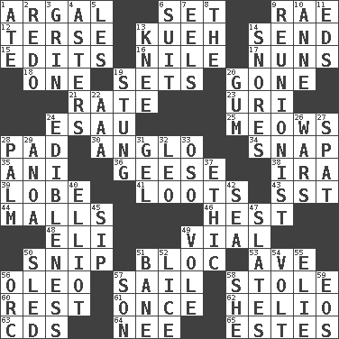 ACROSS 1. Therefore, facetiously 6. Arrange properly for use 9. Actress Charlotte 12. Laconic 13. Malaysian steamed pastry 14. Transmit 15. Prepares for publication 16. Mediterranean tributary 17. Religious women 18. Single 19. Arranges properly for use 20. Went 21. Assign a rank or rating to 23. RI univ. 24. Son of Isaac 25. Catcalls? 28. Writing tablet 30. White American of non-Hispanic descent 34. Fastener 35. Cuckoo 36. Honkers 38. Lyricist Gershwin 39. Ear part 41. Plunders 43. Fast jet (abbr.) 44. Shopping centers 46. Behest 48. Connecticut Ivy Leaguer 49. Small bottle 50. Clip 51. Alliance 53. "___ Maria" 56. Margarine 57. Travel by water 58. Fur scarf 60. Relief 61. At one time in the past 62. Sun: prefix 63. Music discs 64. Born 65. _____ Park, CO DOWN 1. Had dinner 2. Do over again 3. Amused look 4. Michaelmas daisies 5. French article 6. Costume for a special activity 7. Snakelike fish 8. Definite Article 9. One who advocates reunion 10. Queen of England 1702-14 11. Begley and Asner 13. Leg joint 14. Sounds asleep 19. Feeling sharp psychological pain 20. Chewing product 22. American Automobile Association (abbr.) 24. The property of being fit to eat 26. Armed conflicts 27. Petty quarrel 28. Inside of hand 29. Small Philippine buffalo 31. Set 32. Lion 33. Bear (Spanish) 37. Principle of right and wrong 40. American author Paul (1891-1958) 42. Ocean 45. Small drink 47. Chalkboards 49. Grand slam 50. Downhill vehicle 51. Object of repulsion 52. Louse (plural) 54. Electrical Unit 55. Writer Wiesel 56. The grampus (Milton) 57. Male offspring 58. A female animal or person 59. Greek goddess of the dawn