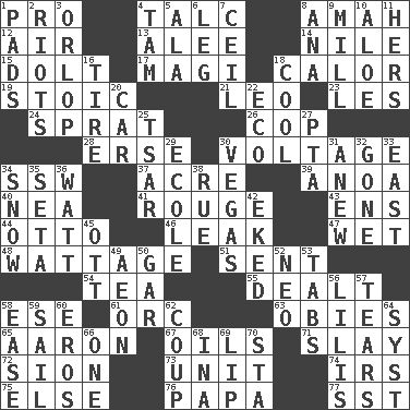 ACROSS 1. Adept person 4. Baby powder 8. Nanny 12. Wind 13. Toward shelter 14. "Death on the ____" 15. Stupid person 17. Wise men 18. Bodily heat indicating an inflammation 19. Unemotional 21. Lion 23. French article 24. Small fatty European fish 26. Police officer (slang) 28. Celtic language 30. Electrical Measurement 34. Compass dir. 37. Measure of real estate 39. Small Philippine buffalo 40. Teachers' org. 41. Makeup applied to the cheeks 43. Followers of ems 44. "Beetle Bailey" pooch 46. Path through which fluid escapes 47. Soggy 48. Electrical Measurement 51. Posted 54. Afternoon social gathering 55. Started a card game 58. Compass dir. 61. The grampus (Milton) 63. Off-Broadway awards 65. Composer Copland 67. Petroleums 71. Kill 72. The Jewish people; Israel 73. A single undivided whole 74. Big collection agency 75. Otherwise 76. Dad 77. Fast jet (abbr.) DOWN 1. Writing tablets 2. Disturbances 3. Fourth or lowest deck 4. Scottish cap 5. In the manner of 6. Part of a journey 7. To provide with a ceiling 8. Santa ___, CA 9. Place where flour is made 10. _ vera 11. Possessive pronoun 16. Become fatigued 18. Calm and collected 20. Automobile 22. Environmental prefix 25. Russian ruler of old 27. Parent Teacher Assoc. 29. Learning spot: Fr. 30. Viva Las _ 31. Afresh 32. Went 33. 90 degrees 34. Overwhelm 35. Stalk of a moss capsule 36. Electrical Unit 38. Sorrow 42. Made supply last 45. Baseball player Mel 49. Period of immesurable duration 50. Slender fish 52. Modern: prefix 53. Bar bills 56. Ms. Damita and namesakes 57. Pulls into pieces 58. Relaxation 59. Travel by water 60. Greek god of love 62. Clever action or accomplishment 64. System (abbr.) 66. Single 68. _ tizzy (2 wds.) 69. Mouth edge 70. R.R. building