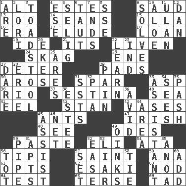 ACROSS 1. The first octave above the treble staff 4. _____ Park, CO 9. Saudi Arabian king (1953-1964) 13. Friend of Pooh 14. Seines 15. Spanish pot 16. Epoch 17. Evade 18. Grant temporary use of 19. Binary compound 21. ___ a Wonderful Life 22. Make or become more lively 24. Heroin 26. Compass dir. 27. Prevent from occurring 29. Writing tablets 30. Came up 31. Practice fight 33. Cleo's killer 36. River (Sp.) 37. French poetic form 40. Ocean 41. Snakelike fish 42. Comedian Laurel of Laurel & Hardy 43. Flower holders 45. Pismires 47. From or relating to Ireland 48. Perceive with the eye 49. Lyric poems 50. Thick mixture 52. Connecticut Ivy Leaguer 54. _ moment's notice (2 wds.) 56. Native american tent (variation) 57. Inhabitant of Heaven 59. Santa ___, CA 61. Elects 62. 1973 Nobel Price Winner (Physics) Leo 63. Allow head to fall sleepily 64. Trial 65. Laconic 66. Small boy DOWN 1. "We ___ not amused" (Victoria) 2. Australian parrot (variant) 3. Inedible or poisonous agaric 4. Compass dir. 5. Former Milwaukee Brewers owner Bud 6. Pulled tight 7. Conclusions 8. Compass dir. 9. Finds the solution 10. Medicinal plant 11. ____ Bator, Mongolia 12. Daniel's nick name 20. Supplements with great effort 22. Memorize 23. Working for oneself (abbr.) 25. Ancient Greek god of war 27. Have the gumption 28. 4th largest of the Great Lakes 29. Ache 31. Fast planes 32. Parent Teacher Assoc. 33. Helper 34. Perceives with the eye 35. Romantic infatuation 38. First name in cosmetics 39. Enthusiastic 44. Length times width 45. Aid 46. Fish or hair follower 49. Pig sounds 50. Corncob 51. Flats, for short 52. Comfort 53. One who doesn't tell the truth 55. Small Philippine buffalo 56. Small child 57. Arrange properly for use 58. Neckwear 60. Say or write further