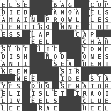 ACROSS 1. Otherwise 5. Paper or plastic container 8. Police officer (slang) 11. Passed on 12. Small Philippine buffalo 14. Raised railways 15. At full speed 17. Move like a hungry wolf 18. French article 19. Small, flat, pigmented spot on the skin 21. Compass dir. 22. Car dealer's back yard 23. Curvy letter 24. Infant locale 25. Head covering 27. Snakelike fish 28. Burn to charcoal 31. Slit 35. Whopper 37. Heavy book 38. Food container 39. Dreamland 41. Singles 42. Opposed to 43. Ocean 45. Monthly bill 46. Peachy ____! 47. Title for a knight 49. Born 51. Binary compound 52. R.R. building 55. It is so 57. Superhero pair 60. Legislator 62. Biblical high priest 63. Small island 65. Resident of Iraq 66. 54 in ancient Rome 67. Snakelike fish 68. A slight indication 69. Area sheltered from the wind 70. Actress Charlotte 71. Person who is morally reprehensible DOWN 1. Peak District village in England 2. Citrus fruits 3. Actors Connery and Penn 4. Prepare for publication 5. Long, evenly shaped piece 6. Soon (poet.) 7. Bride's dress 8. Portable communications device 9. Butter sub 10. Inconspicuous attention getter 13. Actor Baldwin 16. "Death on the ____" 17. Cotton for raincoats, e.g. 20. Highlander 26. Thespian 29. So be it 30. Take ten 31. Neighbor of Neb. 32. Actor's bit 33. Clearly or manifestly demonstrative 34. One or ones belonging to thee 36. Greek goddess of the dawn 40. Stop 44. Helper 48. Painter Guido (1575-1642) 50. Singer Brickell 52. Having lost freshness 53. Woman's close-fitting hat 54. Satellite of Uranus 55. Shout 56. Writer Wiesel 58. One who uses or employs something 59. Spanish pot 61. Bowlike part 64. Compass dir.